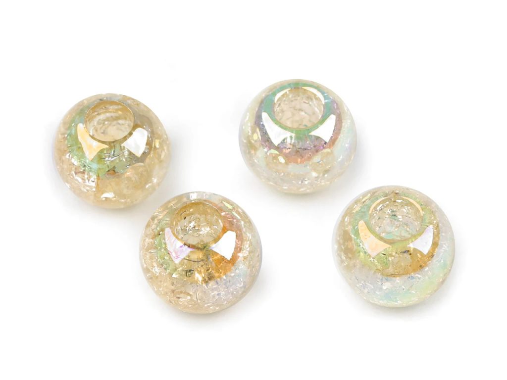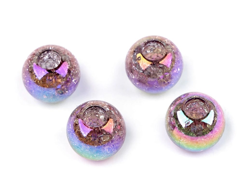 Velké plastové korálky nadchnou děti i dospělé. Jsou doslova magické, protože mají vysoký lesk s AB efektem, navíc uvnitř mají působivé kraklé - praskliny, které se lidově nazývají práskačky. Korálky jsou velice kvalitní, všude hladké, nemají žádné otřepení nebo viditelné švy. Našim fotografům se fotografie velmi povedly, ale věřte, že ve skutečnosti jsou korálky ještě zajímavější.
