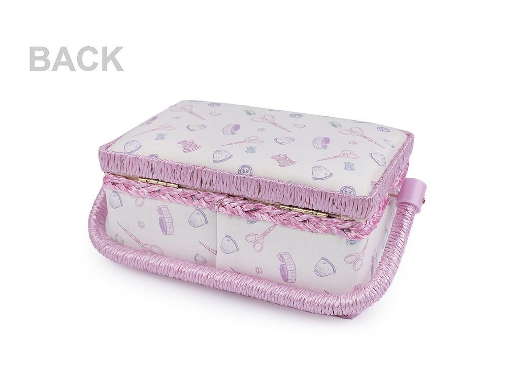 Malý čalouněný košík na šicí potřeby je skvělým pomocníkem pro každou švadlenku. Na vnitřní straně víka má jehelníček a kapsičku. Uvnitř má plastové mezipatro se 2 malými a 1 dlouhou přihrádkou, do kterých si lze šicí potřeby uspořádat. Patro se dá snadno vyjmout. Výška mezipatra je 3 cm. Košík má zapínání na magnet. Díky kvalitnímu pevnému uchu jej můžete snadno přenést.