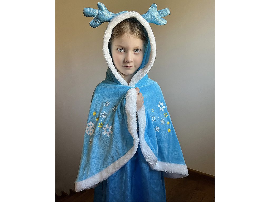 Karnevalový plášť pro malou ledovou královnu je měkký a velmi příjemný na dotek. Lemuje ho plyšová kožešinka, na kapuci jsou našité třpytivé rohy a pozoruhodným detailem je potisk sněhových vloček. Plášť se zapíná pomocí suchého zipu.Výška rohů je cca 11 cm.