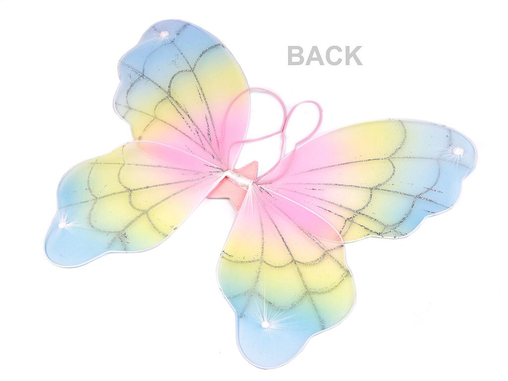 S karnevalovým kostýmem se každá malá slečna promění v nádherného motýla. Kostým se skládá z tylové sukýnky, křídel a čelenky. Sukýnka je ozdobená duhovým metalickým potiskem, v pase je pružná. Křídla jsou oboustranná, vyztužená drátěnou kostrou, ozdobená glitrovými detaily. Ve středu mají hvězdu s glitry, nasazují se pomocí gumiček. Čelenka je pružná, ozdobená textilními motýly s perlami.Rozměry křídel jsou 37 x 48 cm.
