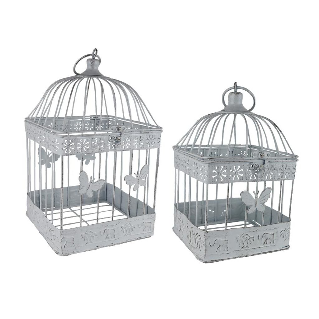 Sada dekoračních kovových klecí. Sada obsahuje 2 klece. Malá klec má rozměry : 18 × 18 cm, výšku 31 cm. Velká klec má rozměry : 13 × 13 cm, výšku 23 cm.