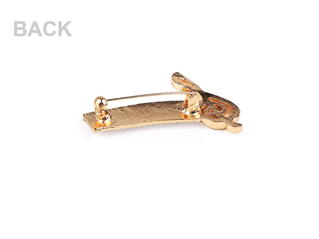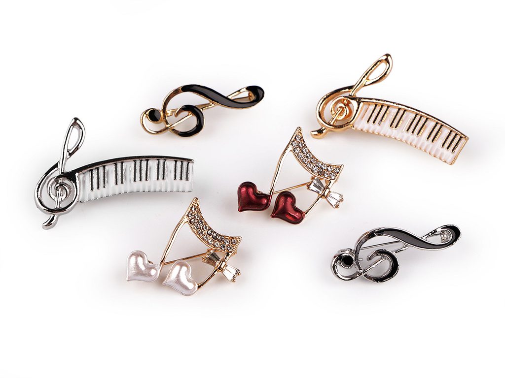 Brož s hudebním motivem ocení všichni muzikanti a milovníci hudby. Je ozdobená barevným smaltem. Kombinace jemných linií a různorodých tvarů, jako jsou noty, houslový klíč a klaviatura, dodává broži unikátní šarm. Ze zadní strany má brožový špendlík.Efektně působí nejen na oděvech, ale je vhodná i k ozdobení klobouků, tašky či sepnutí šátku.