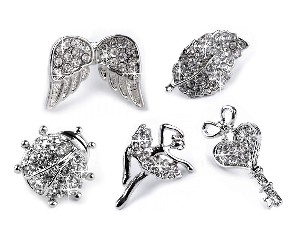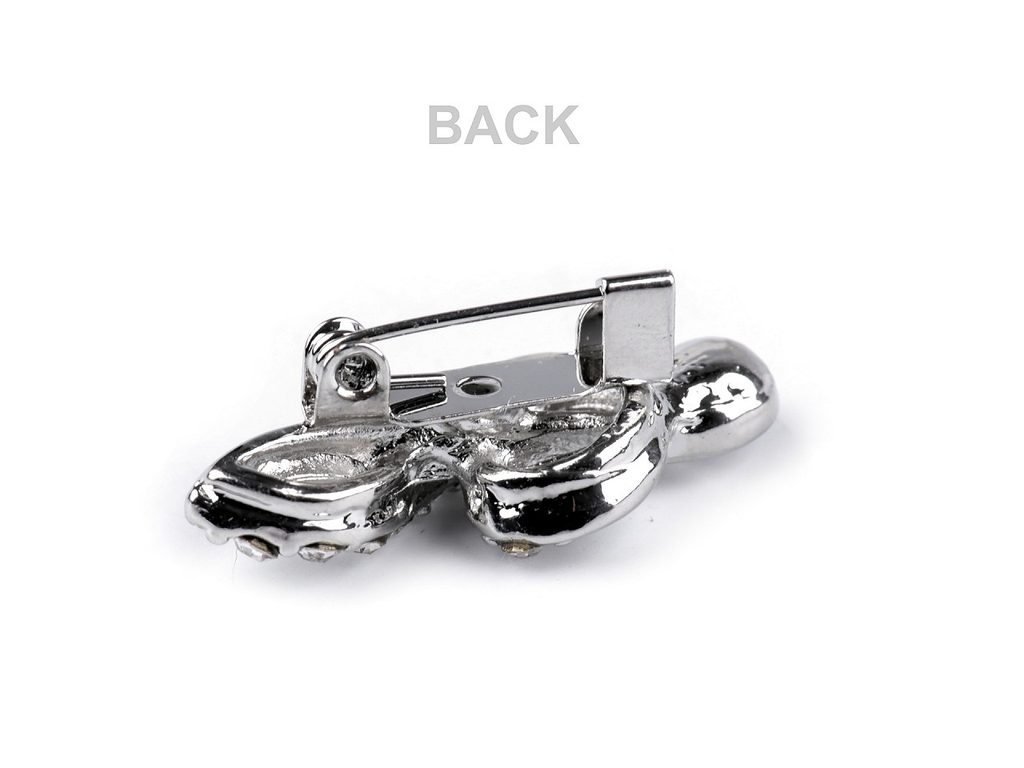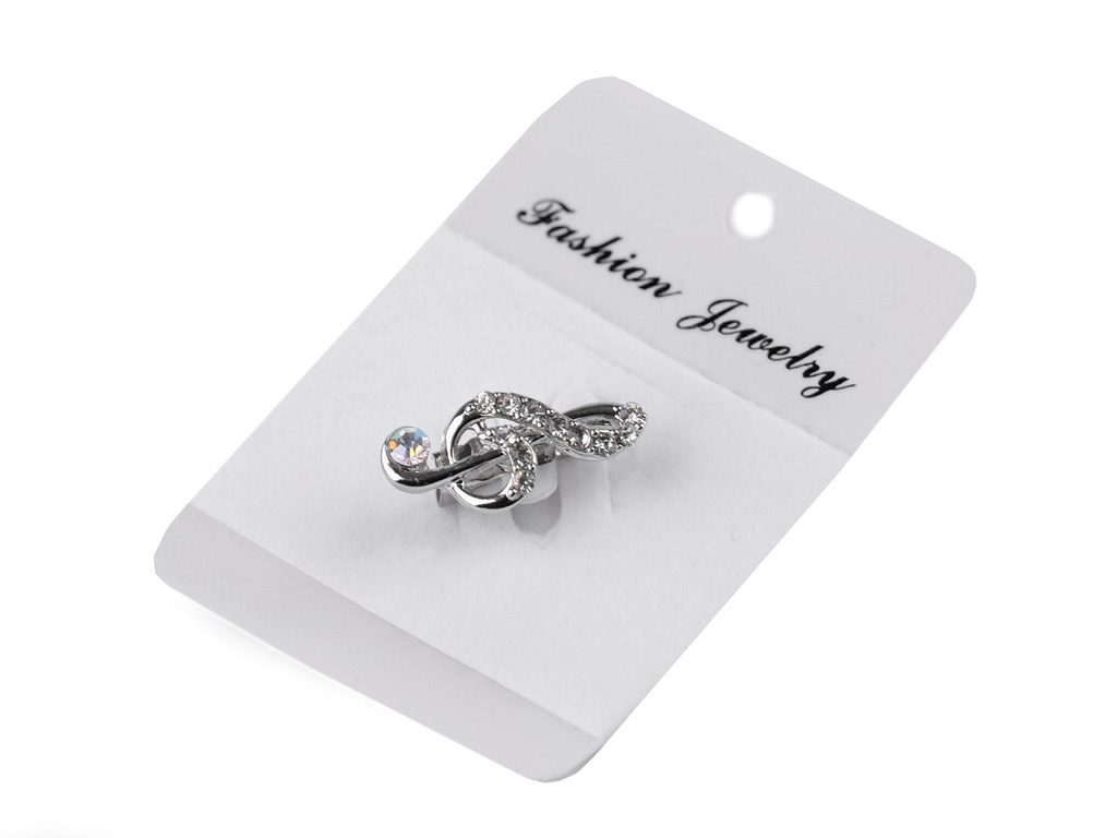 Malá elegantní brož / odznak je ozdobená broušenými kamínky, poutavě se třpytí. Hodí se na klopu kabátu, klobouku, vestu či svetr. Je vhodná i k připnutí na brašnu, jako ozdoba tašky či batohu. Má jednoduché jednobodové zapínání.Rozměry č.1 - houslový klíč - 1,1 x 2,6 cm.