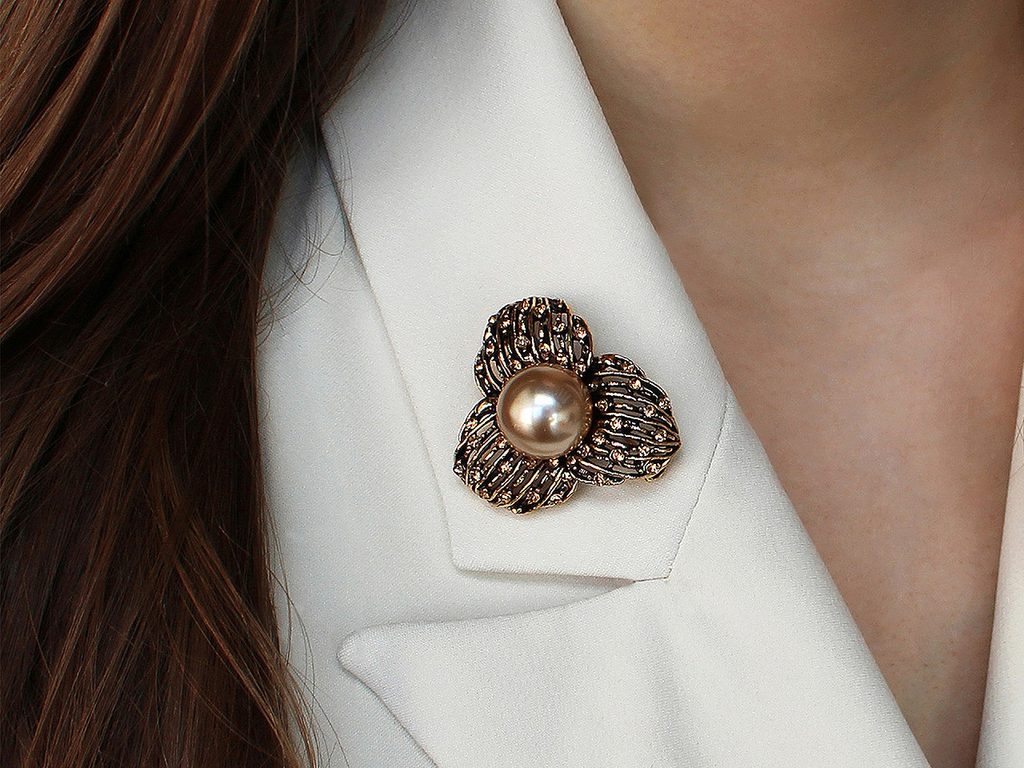 Elegantní brož s velkou perlou ve tvaru květu je výrazný módní doplněk, který okamžitě upoutá pozornost svou zářivostí a luxusním vzhledem. Její kovový základ je osázený broušenými kamínky, které vytvářejí jemné odlesky při každém pohybu. Na zadní straně má brožový špendlík. Můžete ji nosit na oděvech, čepicích, kloboucích, taškách či s ní můžete sepnout šátek.Brož je na kartě, kterou lze zavěsit na prodejní stojany.