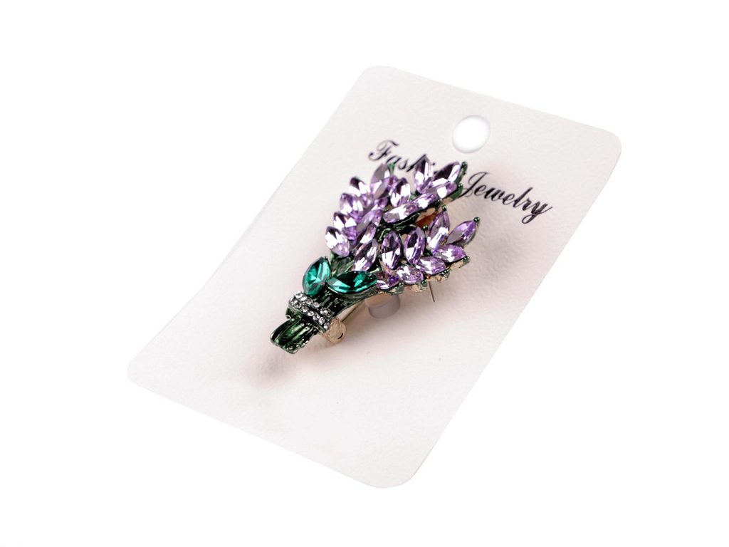 Brož ve tvaru levandule je velice elegantní, je ideálním dárkem pro ženy všech věkových kategorií. Je osázená broušenými kamínky, které se krásně třpytí. Zapíná se pomocí brožového špendlíku.Brož můžete nosit nejen na oděvech, ale hodí se i k ozdobení klobouků, tašky či sepnutí šátku.