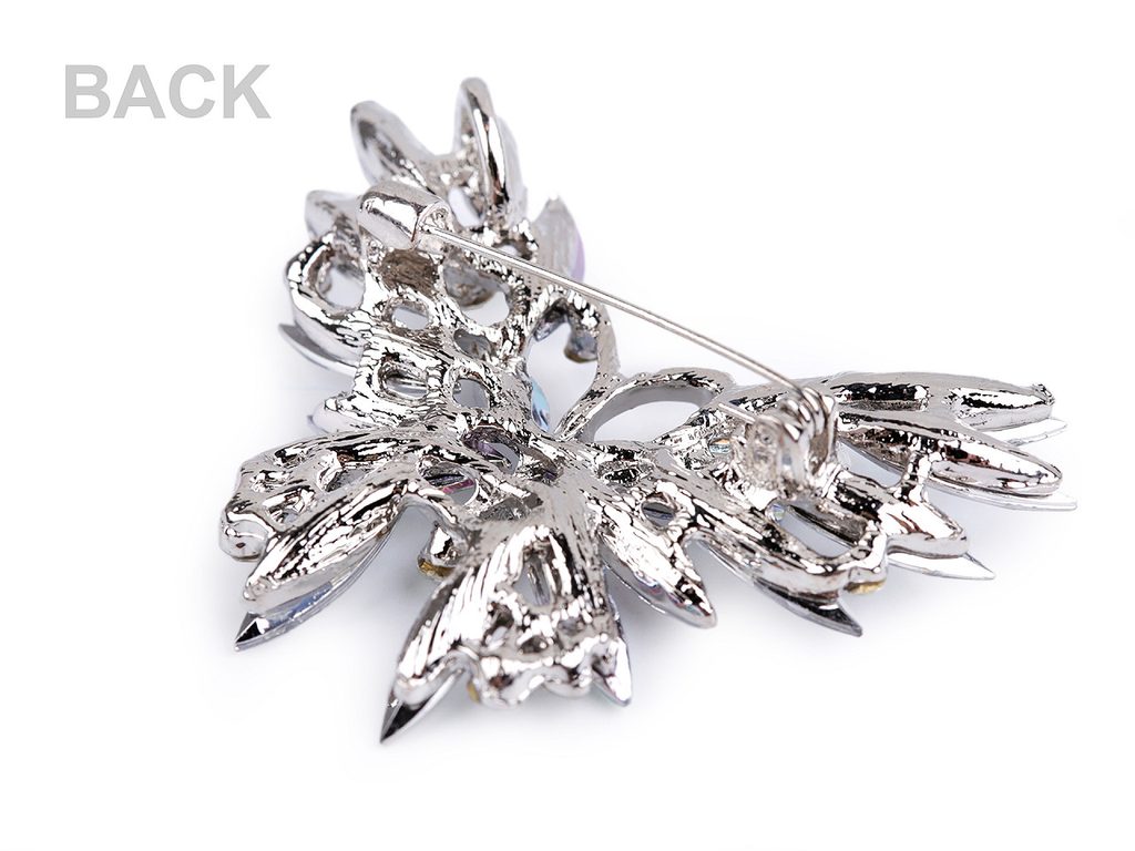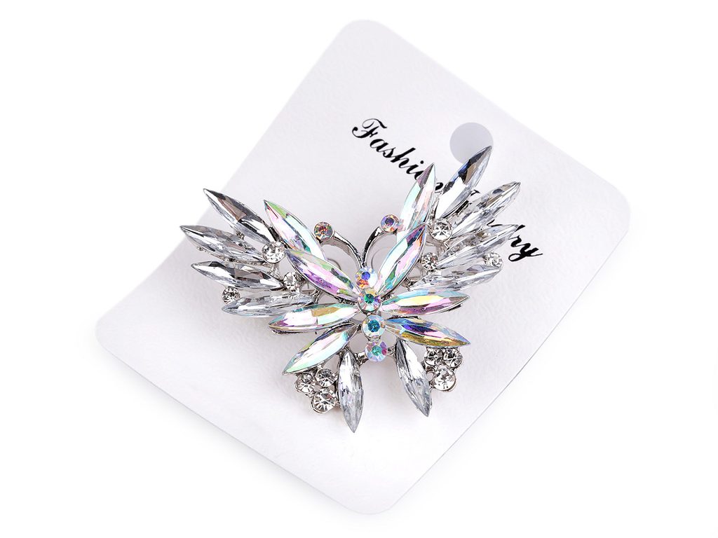 Třpytivá brož motýla je naprosto úchvatná. Díky broušeným kamínkům doslova oslňuje už z dálky. Navozuje dojem, jako by byla poskládaná z ledových sklíček. Můžete ji nosit na oděvech, kloboucích, taškách či s ní můžete sepnout šátek. Na zadní straně má brožový špendlík.Brož je na kartě, kterou lze zavěsit na prodejní stojany.