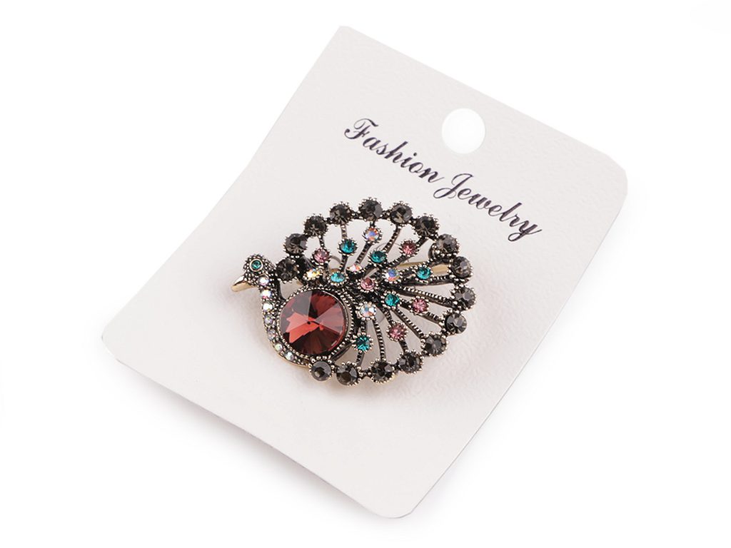 Elegantní paví brož se díky broušeným kamínkům efektně třpytí. Hraje všemi barvami, ale v decentním, tlumeném tónu. Ze zadní strany má zavírací špendlík.Efektně působí nejen na oděvech, ale je vhodná i k ozdobení klobouků, tašky či sepnutí šátku.