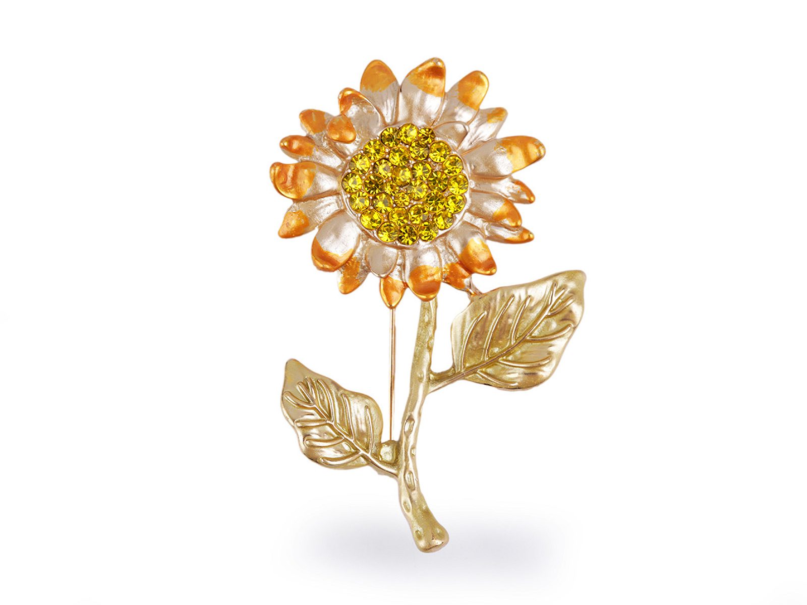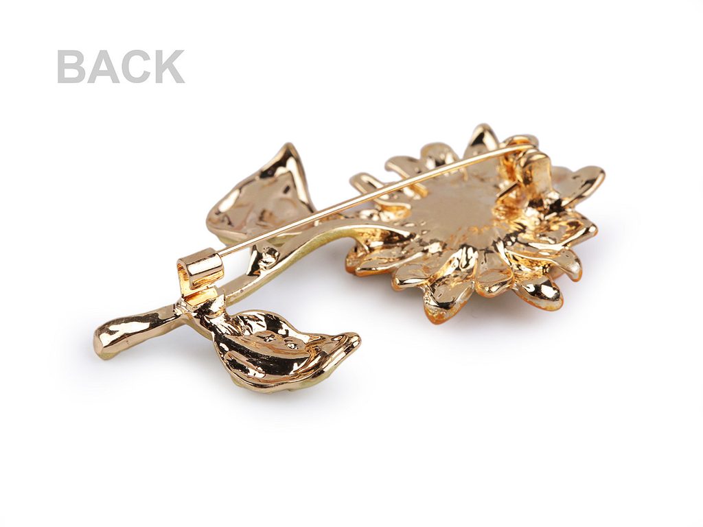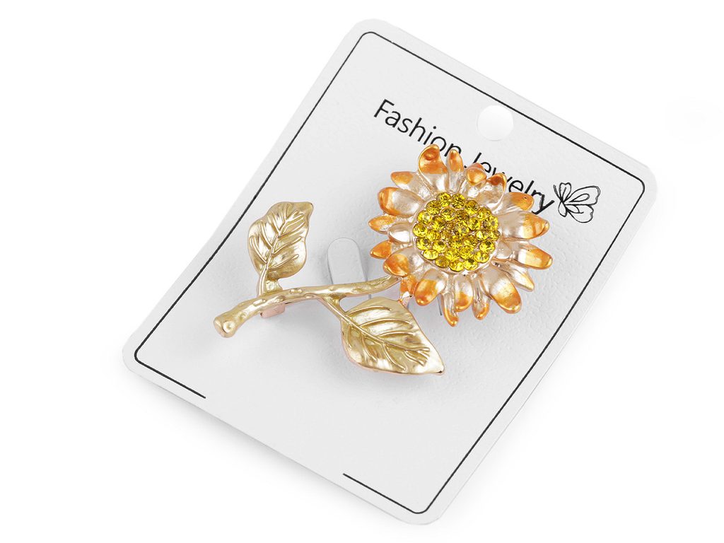 Třpytivá smaltovaná brož slunečnice je elegantní. Střed květu je osázený broušenými kamínky, díky nim se oslnivě třpytí. Brož můžete nosit na oděvech, kloboucích, taškách či s ní můžete sepnout šátek.Brož má vzadu brožový špendlík. Je na plastové kartě, která se dá zavěsit na prodejní stojany.