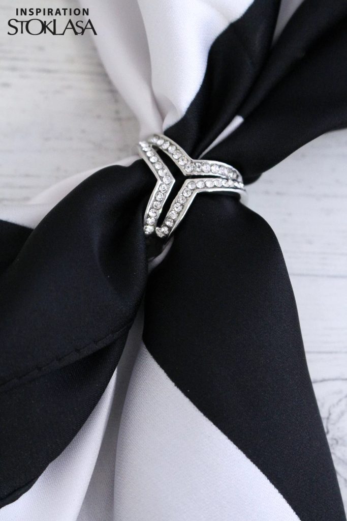 Ozdobnou sponu na šátek zdobí broušené kamínky, které jí dodávají eleganci. Nejlépe vynikne v kombinaci s jemným šátkem.Má celkem 3 průvleky, jenž vybízejí k různým kombinacím nošení. Nejjednodušší použití je vložit cípy šátku do dvou průvleků z boku, z vnější strany a oba najednou vytáhnout dole ze zbývajícího třetího průvleku.