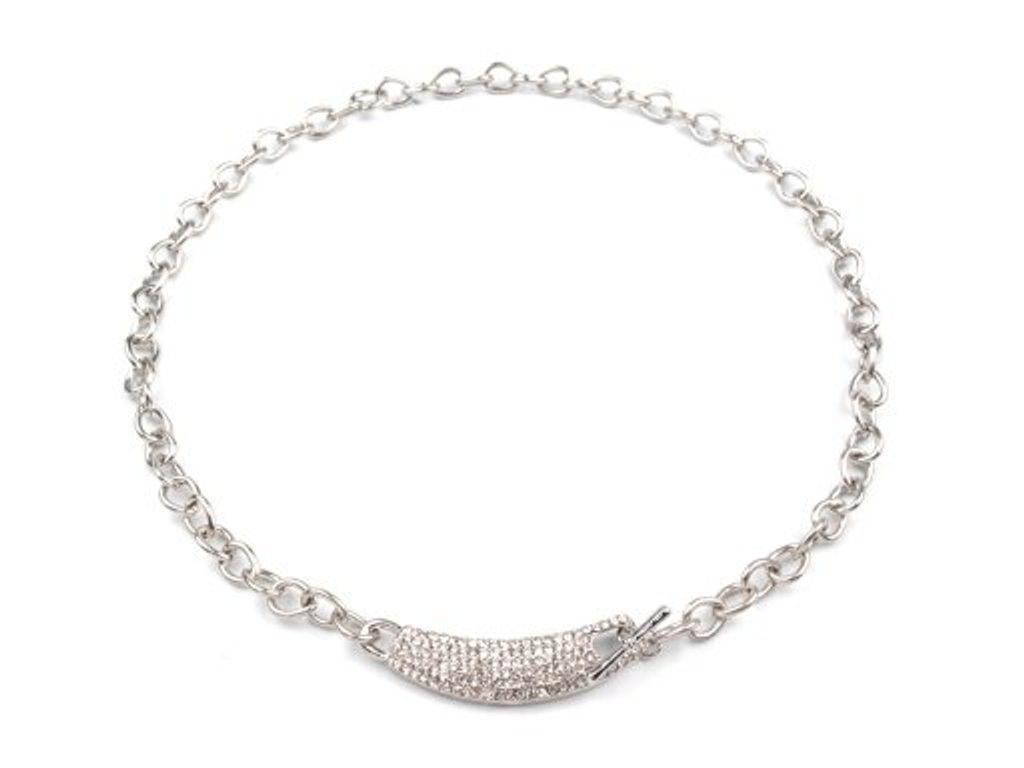 Moderní mladistvý náhrdelník s jednoduchým designem v podobě silnějšího řetízku. Je ukončený americkým zapínáním, které se zapíná do středové ozdoby náhrdelníku. Ozdoba je osázená drobnými skleněnými broušenými kamínky. Délka řetízku je 40 cm, je široký 0,75 cm. Ozdoba je široká 1 cm, dlouhá 4,5 cm.Podobné produkty z kategorie KOVOVÉ NÁHRDELNÍKY ►