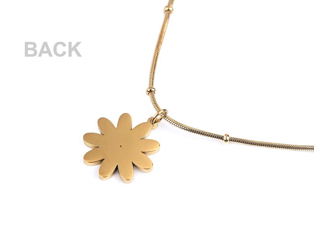 Náhrdelník s půvabným přívěskem květu je vyrobený z kvalitní nerezové oceli. Květ je kromě bílých smaltovaných lístků ozdobený broušeným kamínkem, který se poutavě třpytí. Je zavěšený na hadím řetízku s kuličkami. Náhrdelník decentně dozdobí většinu outfitů.Zapíná se na karabinku s prodlužovacím řetízkem.