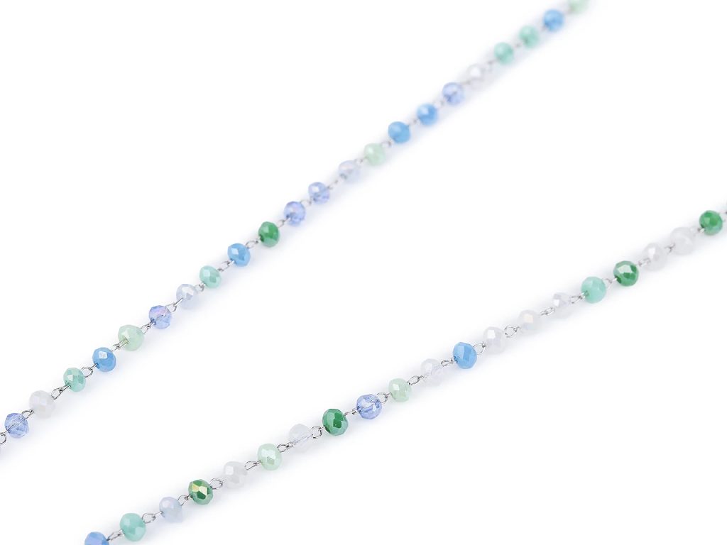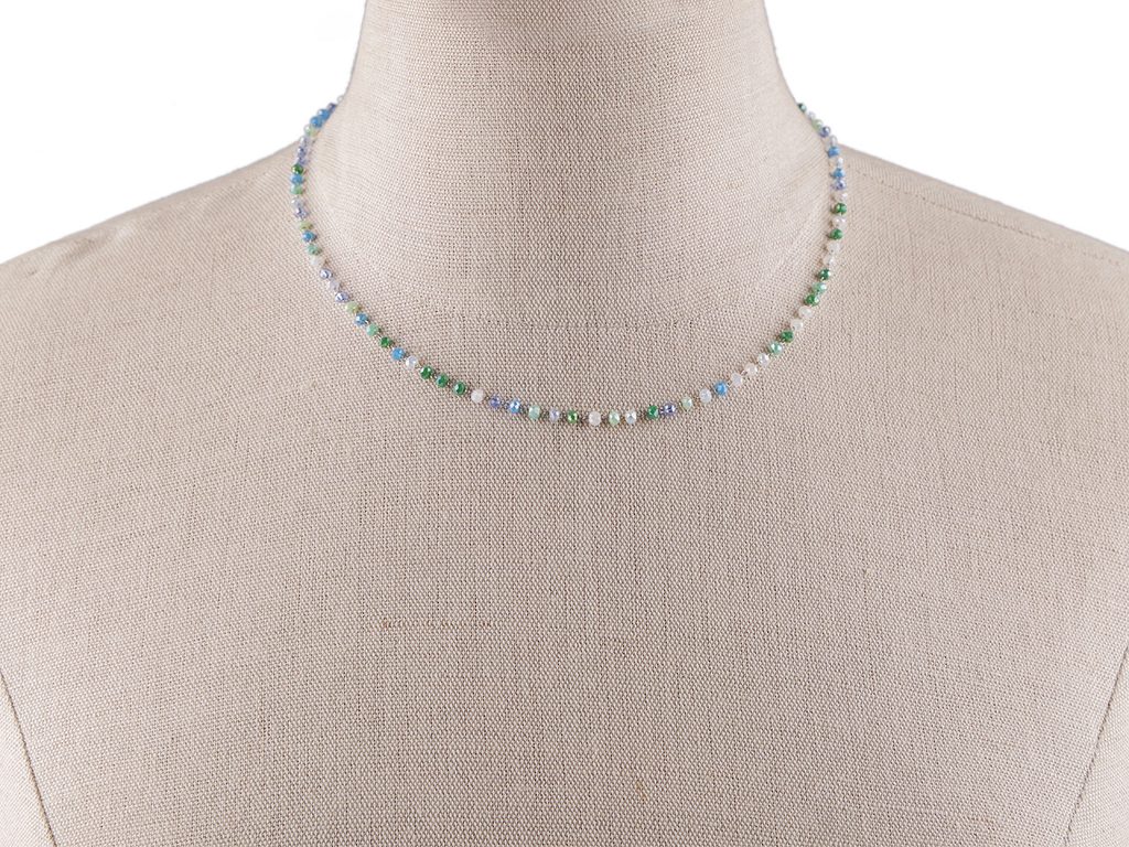 Jemný ketlovaný náhrdelník z kvalitní nerezové oceli je ozdobený barevnými broušenými korálky. Korálky se jemně třpytí, náhrdelník se hodí k slavnostním šatům i na běžné nošení, má velice všestranné využití.Zapíná se na karabinku a prodlužovací řetízek.