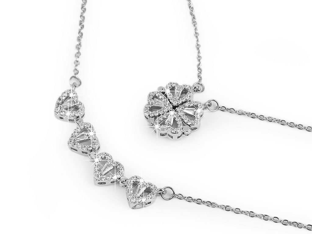 Elegantní náhrdelník s přívěskem "2v1" z kvalitní nerezové oceli je osázený broušenými kamínky. Speciální je přívěsek čtyřlístku, který se dá zatažením rozložit na 4 srdíčka. Má v sobě vložené magnetky, které umožní přívěsek bleskově složit zpátky na čtyřlístek.Přívěsek je umístěný uprostřed na očkovém řetízku.
