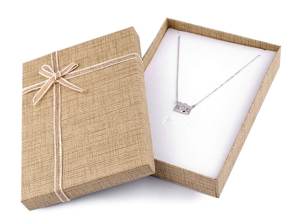 Papírová krabička je určená na šperky. Uvnitř je klasická molitanová výplň s průřezem na náušnice, prsten a řetízek, kterou můžete v případě potřeby vyjmout. Krabička je pevná a víčko zdobí jutová mašle.