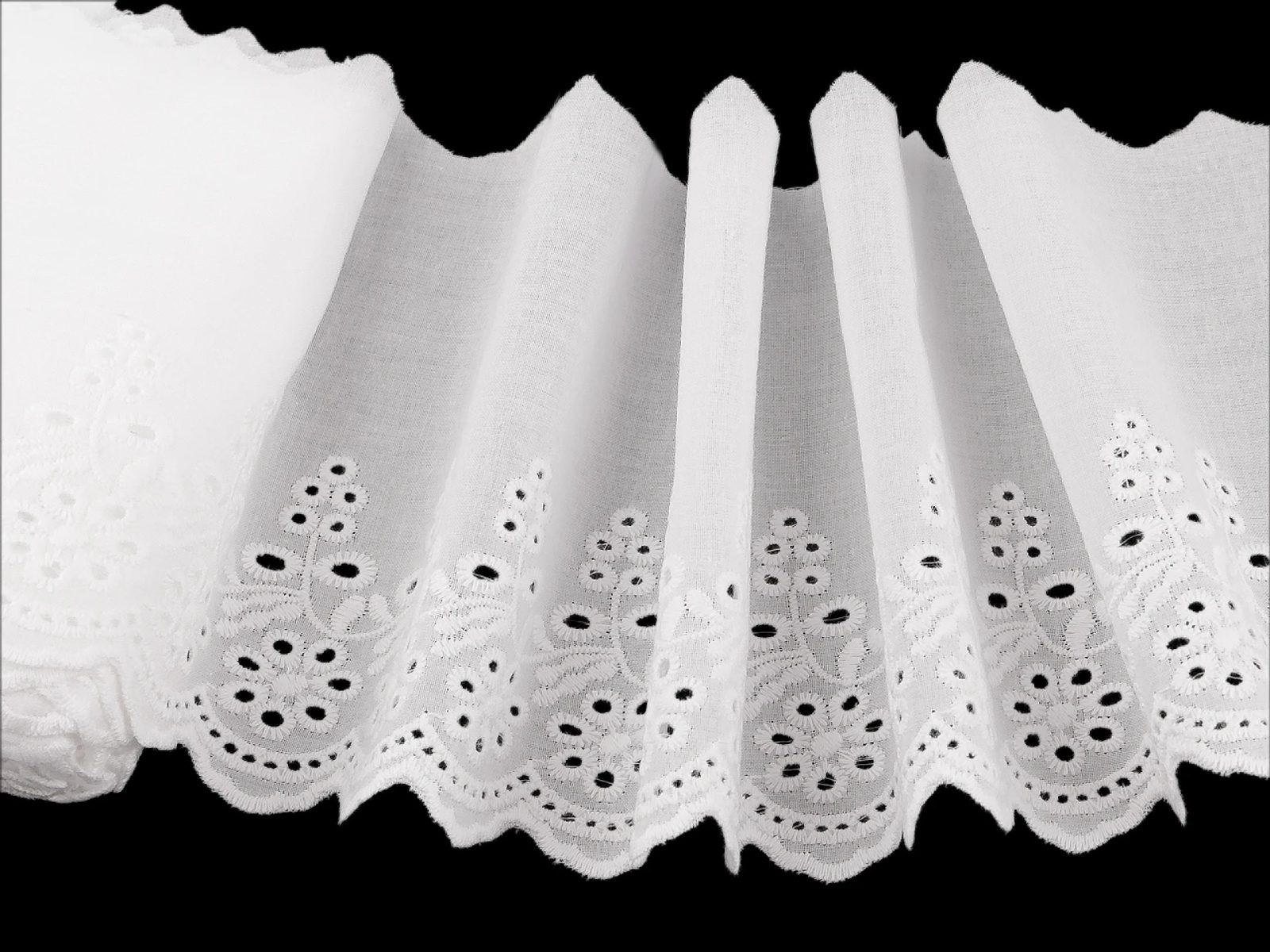 Bavlněná madeira s dírkovanou výšivkou je vhodná k ozdobení ubrusů, závěsů, dekoračních polštářů nebo ložního prádla. Můžete ji našít i na oděvy, kde vytvoří originální a atraktivní detaily jako jsou lemy rukávů, sukní nebo výstřihů.