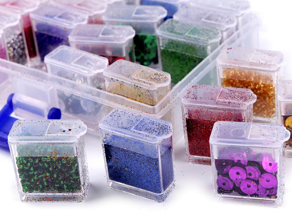 Sada barevných flitrů, rokajlu, mikroperliček a glitrů je uložená v plastovém boxu. Je skvělá na zdobení přáníček v technice scrapbooking, využijete ji i ke zdobení vánočních ozdob.
