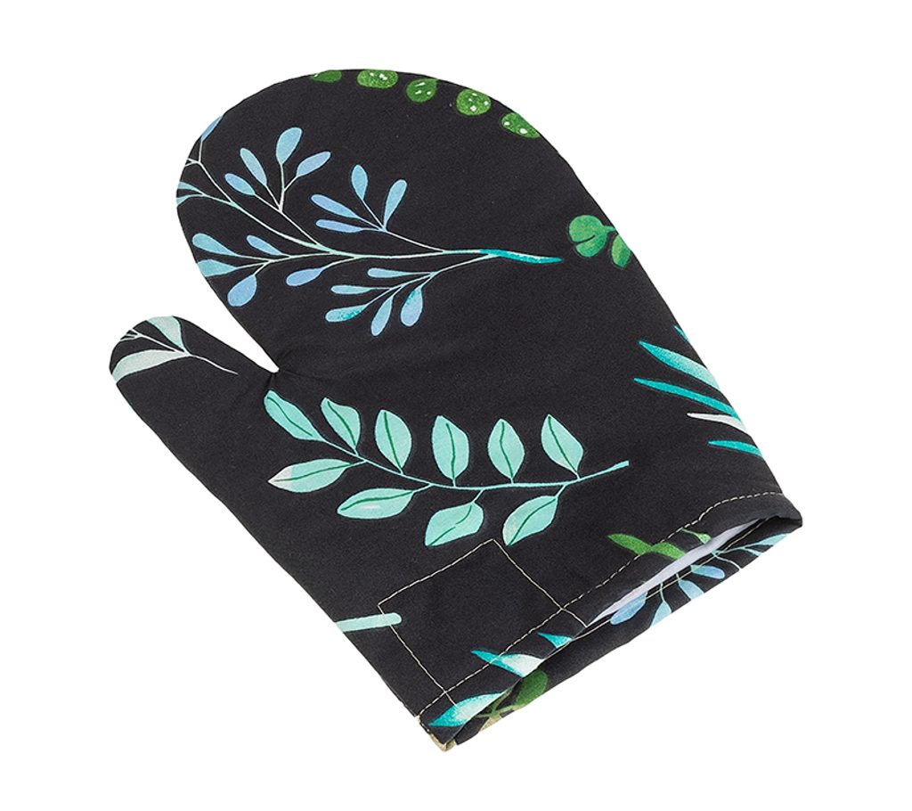 Nepostradatelným pomocníkem každé hospodyňky v kuchyni je kuchyňská chňapka. Použitím chňapky tak zabráníme zbytečnému poranění. Chňapky šijeme ve velikosti 18x28 cm z dostatečně silného materiálu (výplň tvoří netkaná textilie). Tloušťka materiálu tak zaručuje ochranu před popálením při manipulaci s horkým nádobím při vaření. Navíc je chňapka opatřena praktickým magnetem a poutkem na zavěšení. Doporučená teplota praní je na 30°C.- Barva: Lístky na černé
