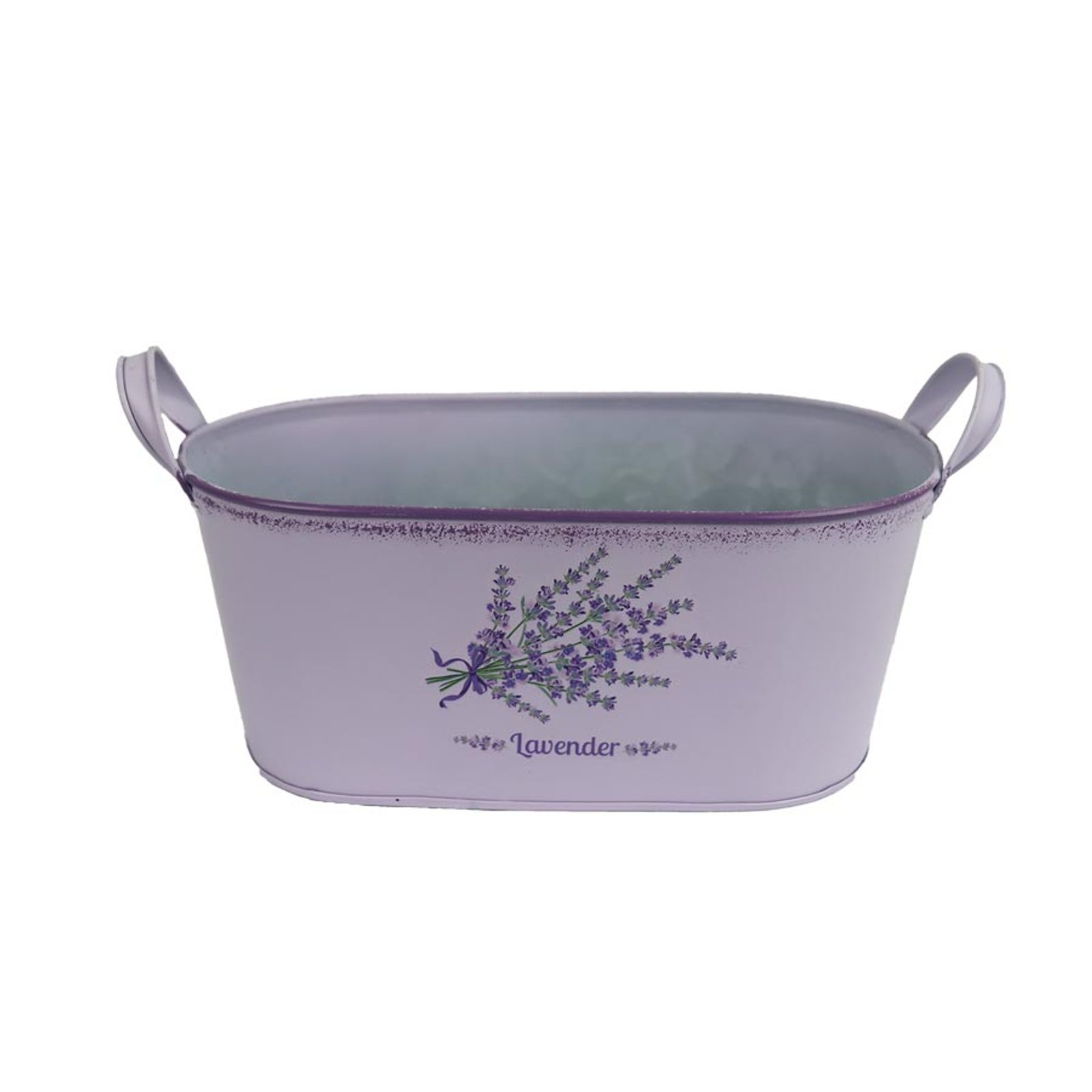 Oválný květináč Levandule. Rozměry : 25 × 13,5 cm, výška 11 cm, celková výška s uchem 14 cm. Barva : fialová. Materiál : kov.