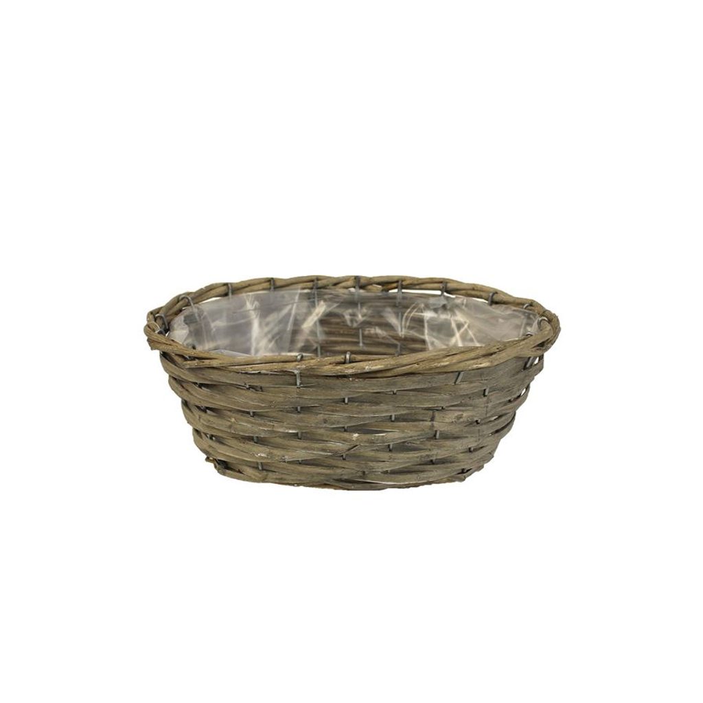 Květináč oválný s plastem. Květináč má rozměry 25 x 16 cm, výšku 10 cm. Barva : šedá. Materiál : proutí, plast.
