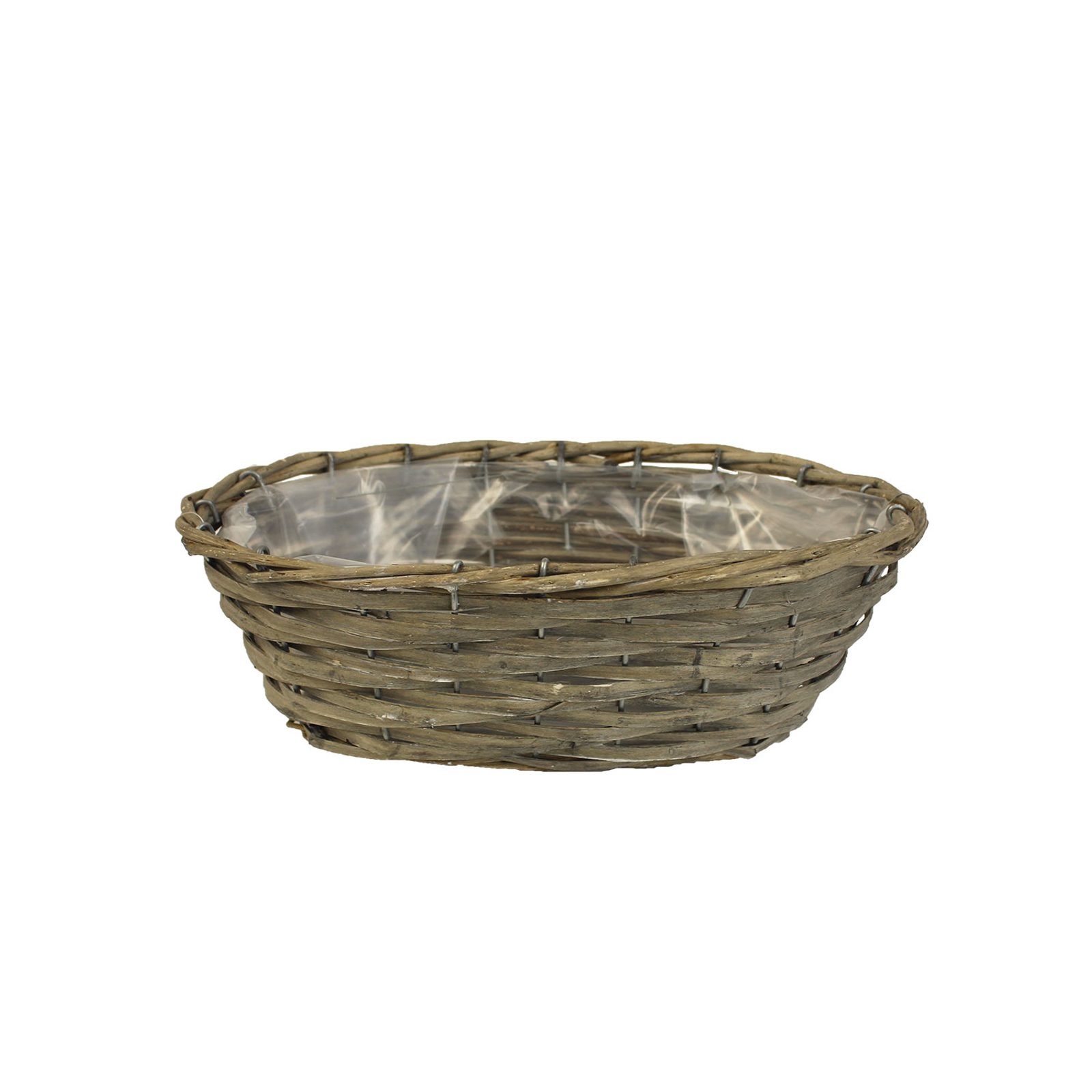 Květináč oválný s plastem. Květináč má rozměry 30 x 17 cm, výšku 12 cm. Barva : šedá. Materiál : proutí, plast.
