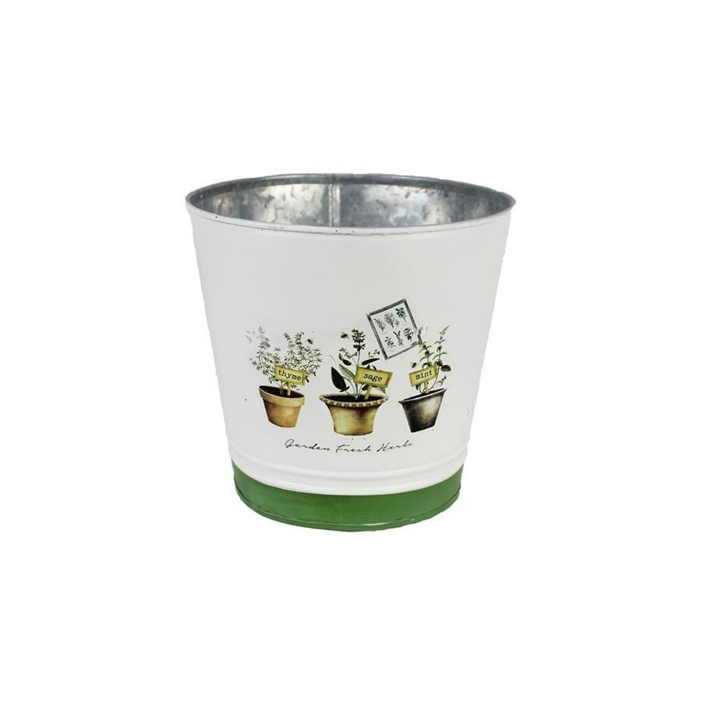 Květináč plechový. Rozměry : průměr 18 cm, výška 17 cm. Barva : kombinace bílá, zelená. Materiál : plech.