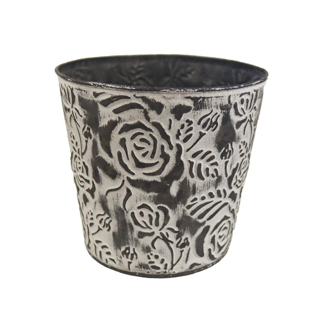 Květináč plechový. Rozměry : průměr 16,5 cm, výška 15 cm. Barva : kombinace šedá s bílou. Materiál : plech.Rozměr: dia 16.5 x15 cm
