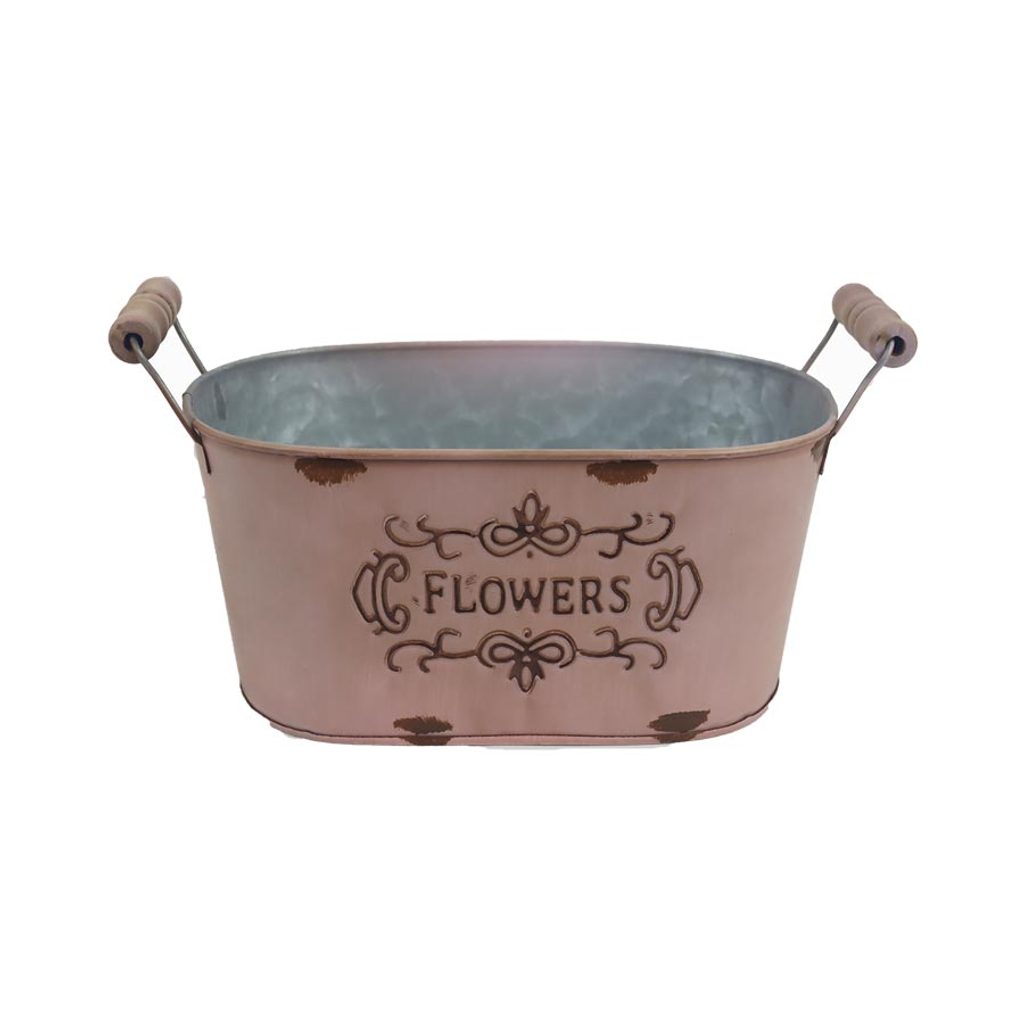 Květináč plechový ovál. Rozměry : 24 × 15 cm,výška 11,5, celková výška s uchem 15 cm. Barva : růžová. Materiál : kov.Rozměr: 24 × 15 × 11,5/15 cm