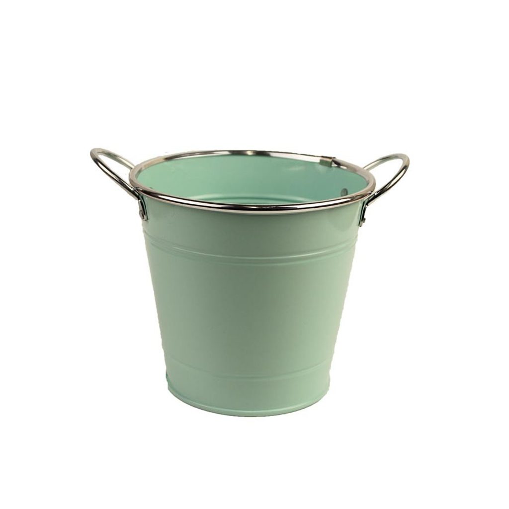 Kovový obal. Rozměry : průměr 14 cm, výška 13 cm. S ušima výška 14,5 cm. Barva : zelená. Materiál : kov.Rozměr: dia 14 x 12 cm