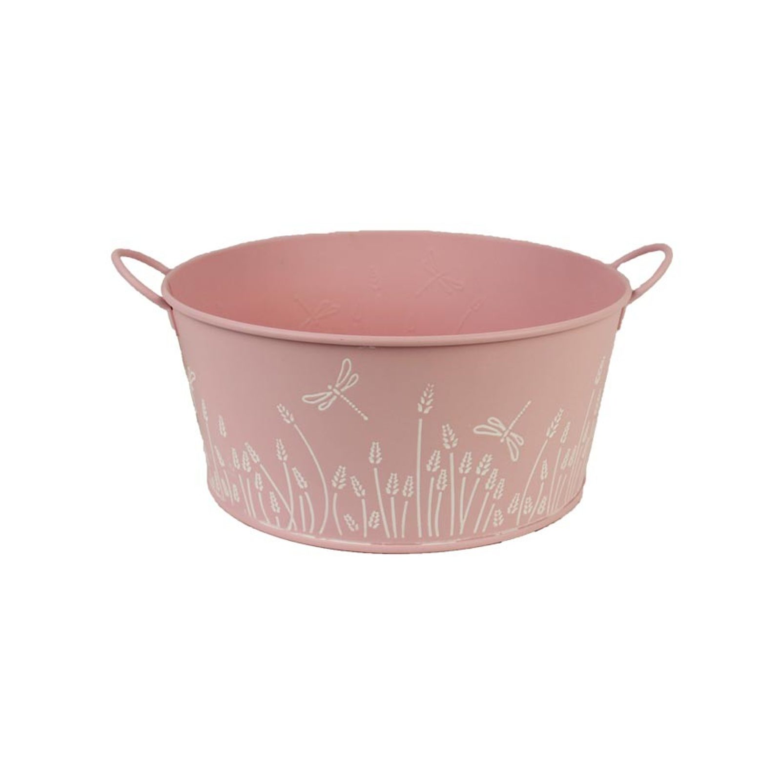 Kovový obal na květiny. Rozměry : průměr 22 cm, výška 10 cm, celková výška s uchy 12 cm. Barva : kombinace růžová s bílou. Materiál : kov.