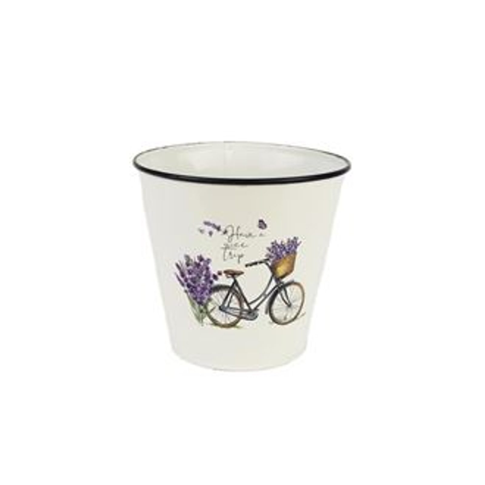 Květináč plechový s motivem levandule. Rozměry : průměr 13 cm, váška 12 cm. Barva : kombinace bílá s fialovou. Materiál : plech.