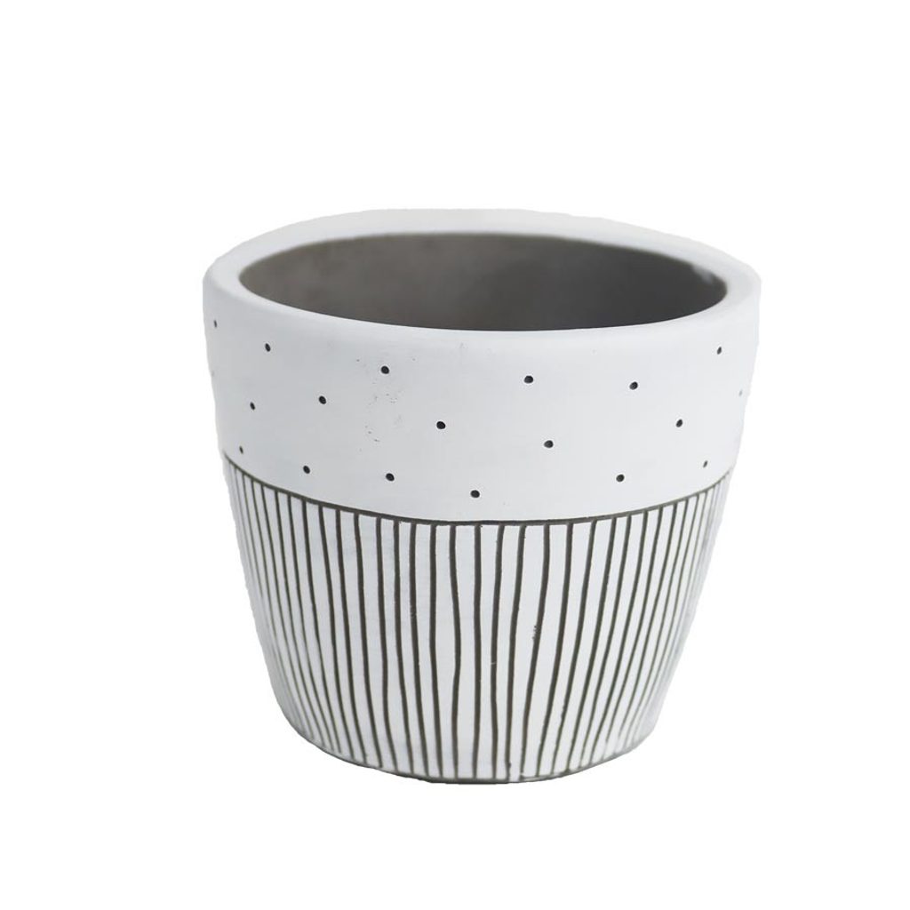 Obal na květiny. Rozměry : průměr 12,5 cm, výška 10,5 cm. Barva : kombinace bílá s šedou. Materiál : beton.Rozměr: dia 12,5 × 10,5 cm