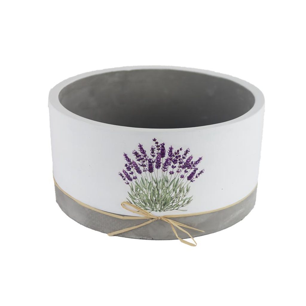 Obal na květiny s motivem levandule. Rozměry : průměr 18 cm, výška 9 cm. Barva : kombinace bílá, šedá, fialová, zelená. Materiál : cement.