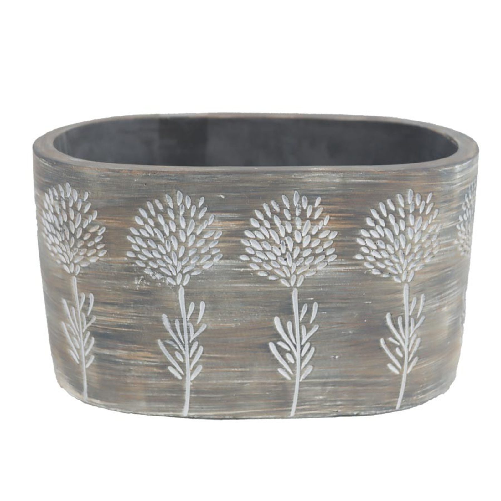 Obal na květiny ovál. Rozměry : 20,5 × 11,5 cm, výška 11 cm. Barva : kombinace šedá, bílá, hnědá. Materiál : beton.Rozměr: 20,5 × 11,5 × 11 cm