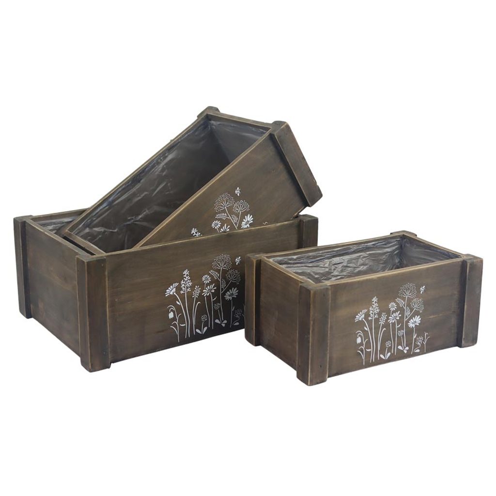 Sada dřevěných obalů s plastem. Sada obsahuje 3 obaly o třech velikostech. Malý obal má rozměry : 21 x 12 cm, výšku 10 cm. Střední obal má rozměry : 25 x 15,5 cm, výšku 11 cm. Velký obal má rozměry : 29 x 19 cm, výšku 12 cm. Barva : hnědá. Materiál na bázi dřeva, plast.