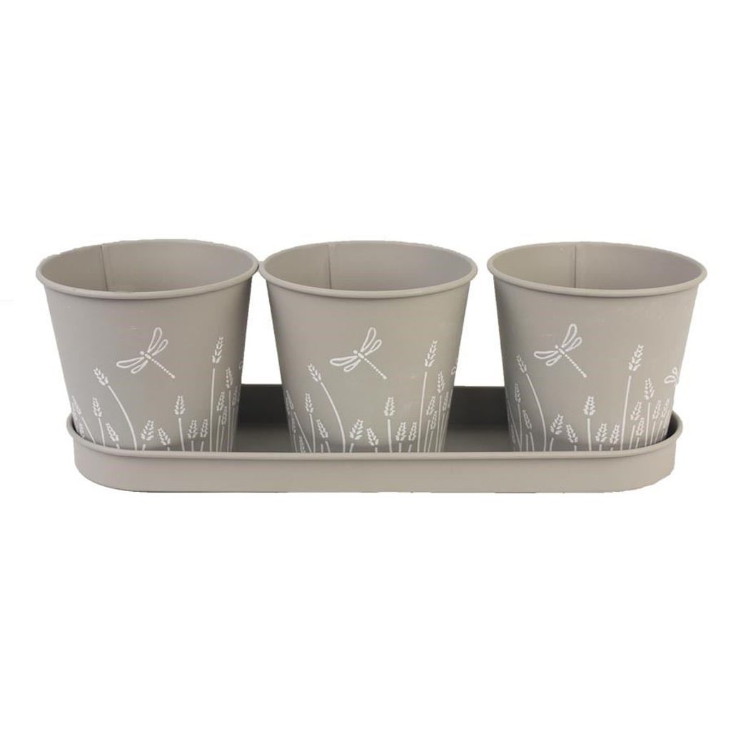 Sada 3 plechových květináčů s tácem. Rozměry květináčů : průměr 11 cm, výška 10,5 cm. Rozměry tácu : 32,5 x 9,8 cm, výška 2,2 cm. Barva : kombinace šedá s bílou. Materiál : kov.