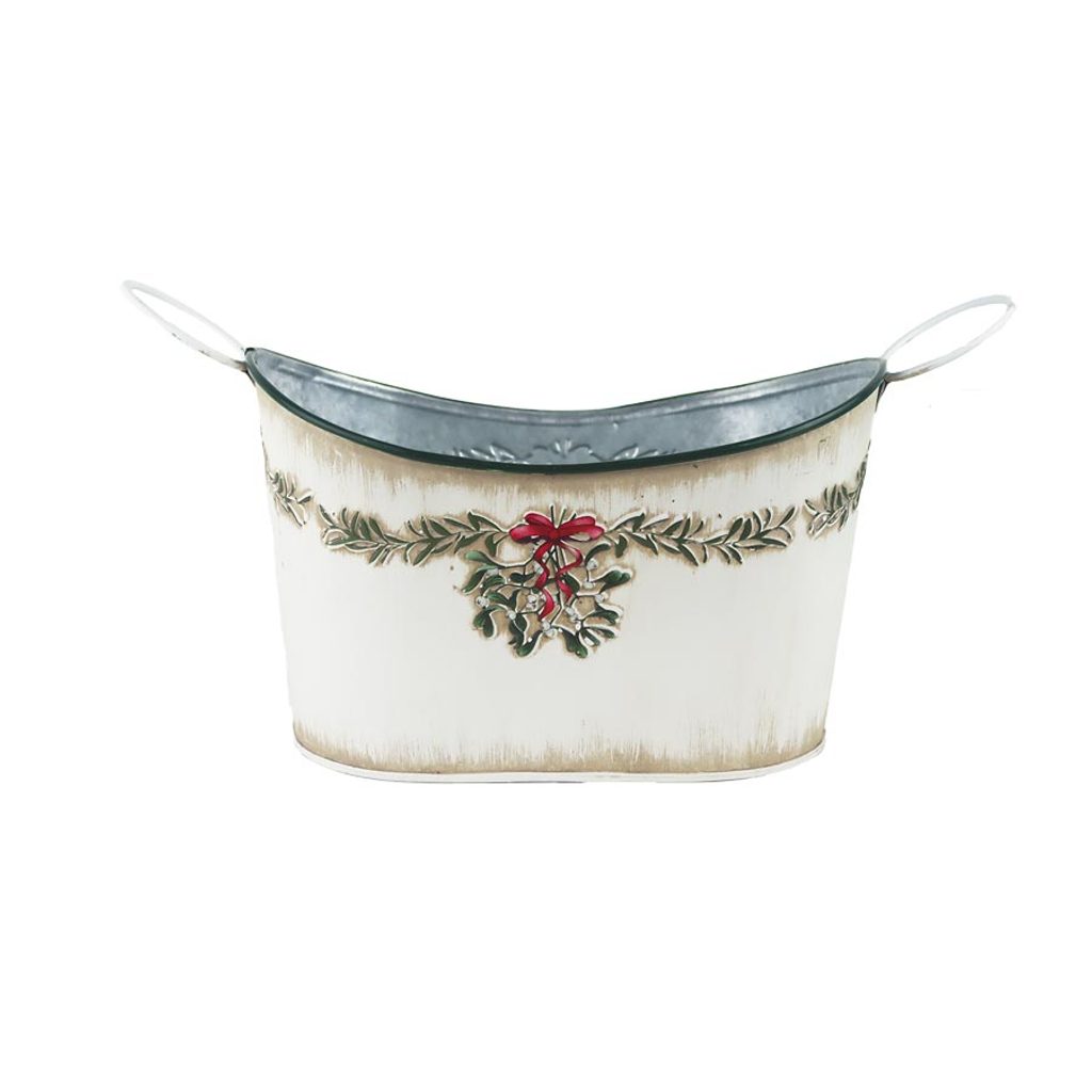 Vánoční plechový obal oválný. Rozměry : 19 x 11 cm, výška 12 cm. Barva : kombinace krémová, zelená, červená. Materiál : kov.Rozměr: 19 x 11 x 12 cm