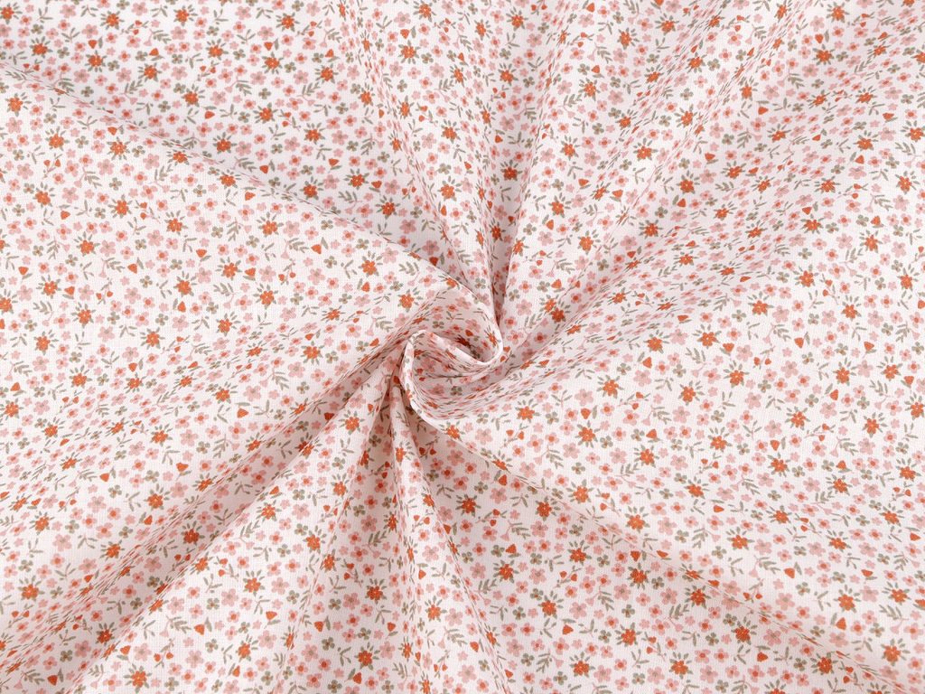 Bavlněnou látku zdobí potisk drobných květin. Využijete ji na šití polštářů, povlečení, závěsů, ubrusů, tašek, pytlíků, zástěr apod.