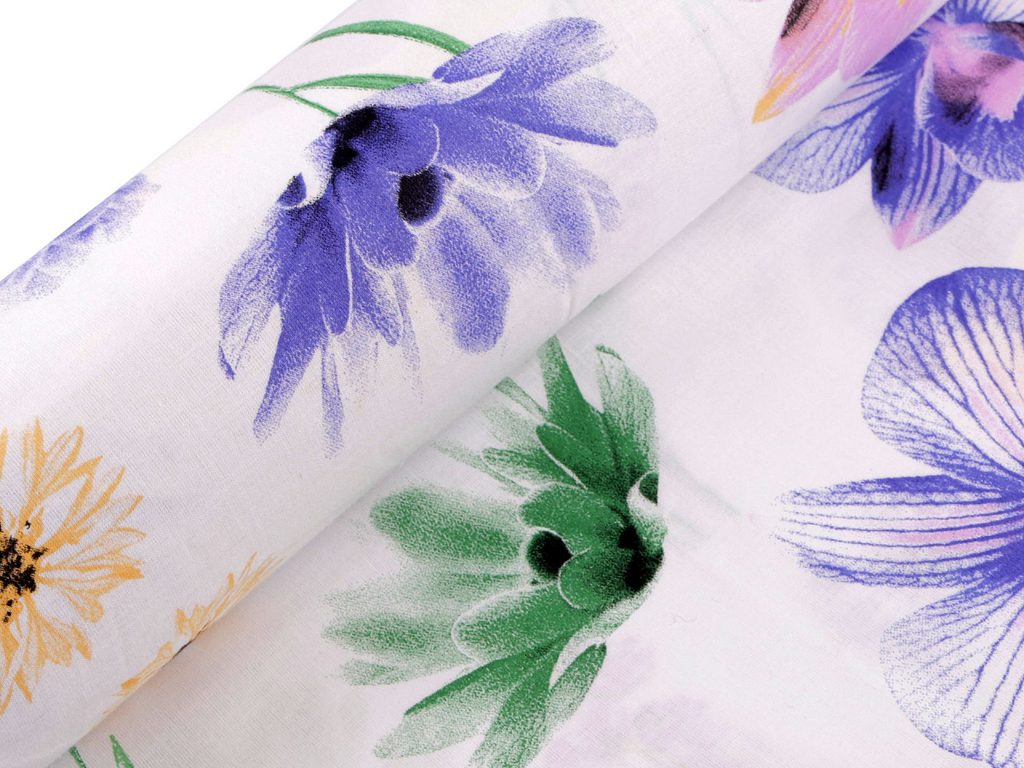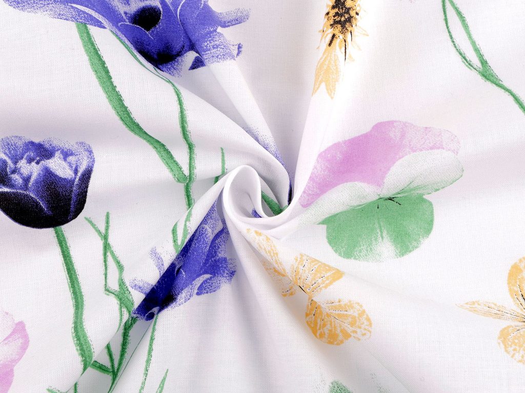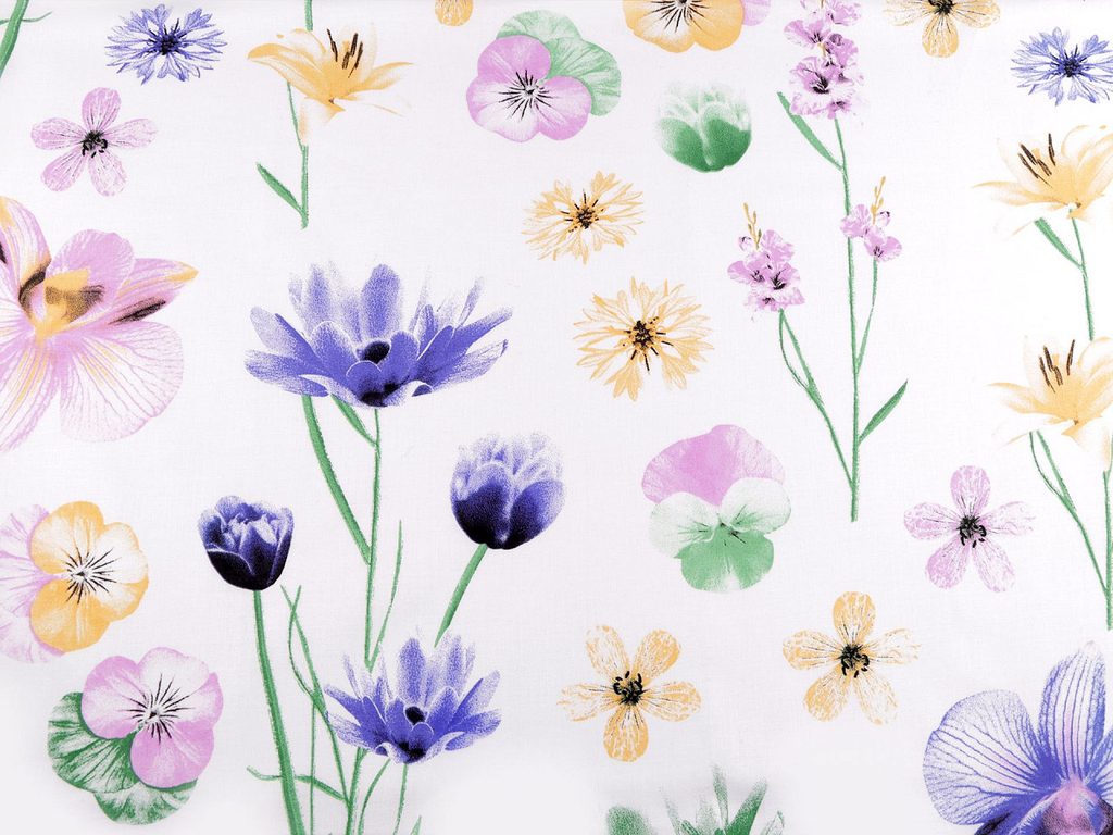 Bavlněnou látku zdobí jemný květinový potisk. Hodí se na šití povlečení, polštářů, závěsů, ubrusů, tašek, pytlíků a různých bytových dekorací a doplňků.- Šíře:: 160 cm