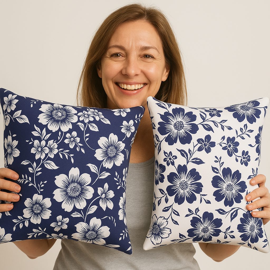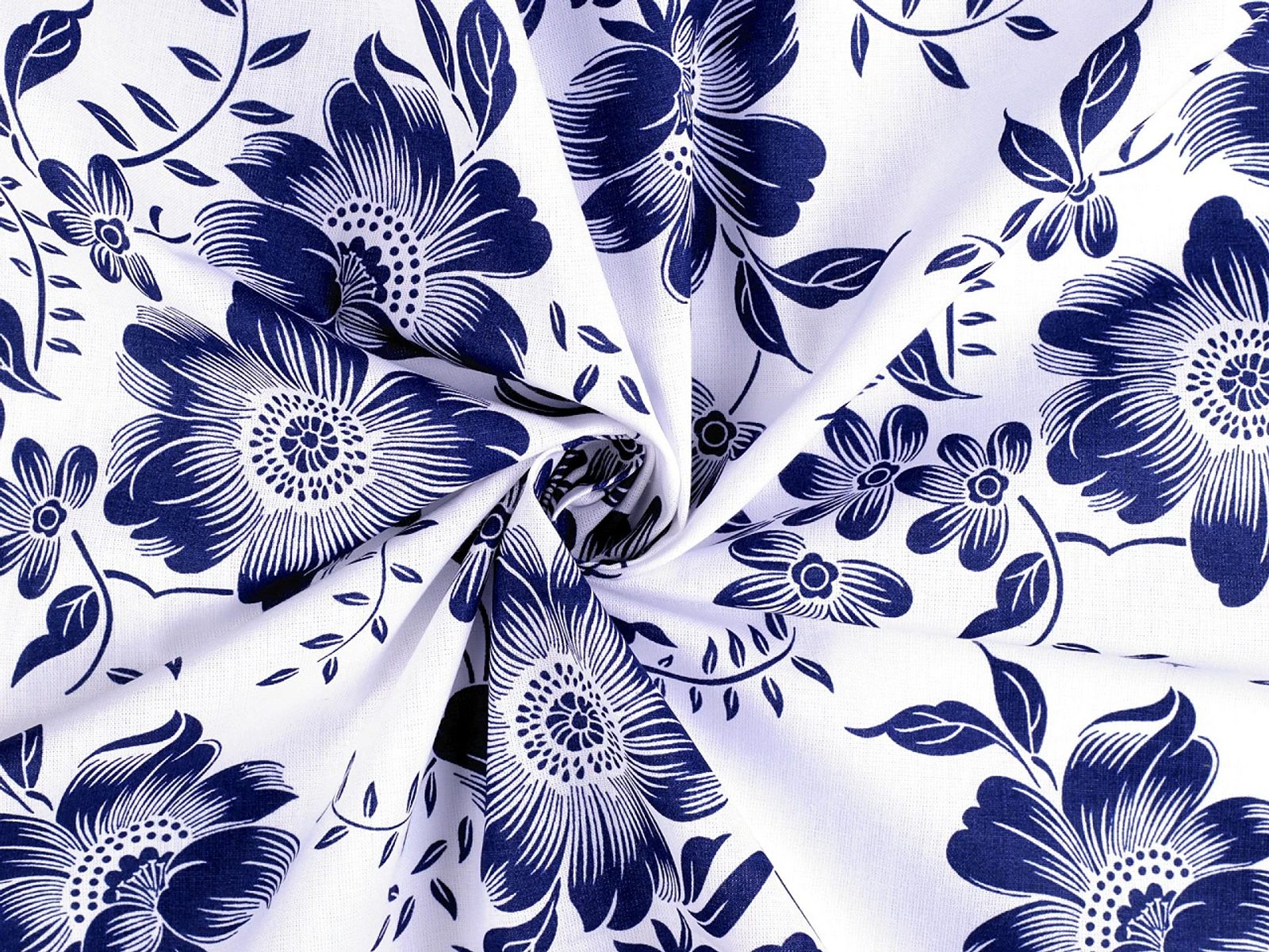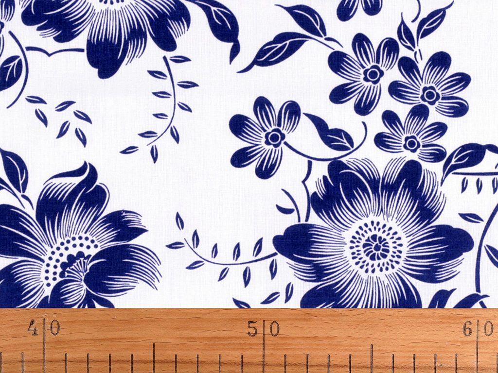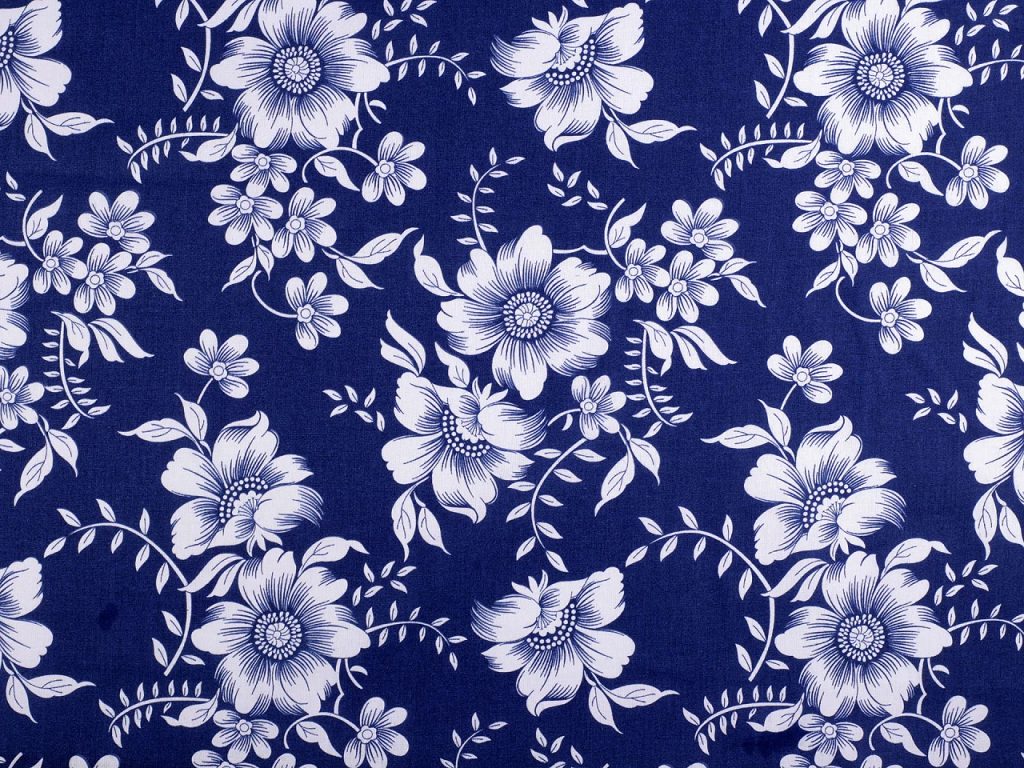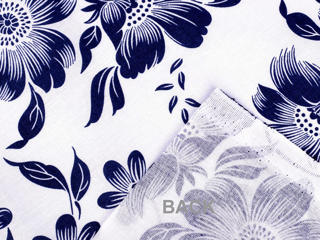 Bavlněné plátno zdobí potisk květů. Připomíná tzv. modrotisk. Hodí se na šití ubrusů, prostírání, závěsů, tašek, pytlíků, povlečení apod.- Materiál: bavlna 100%