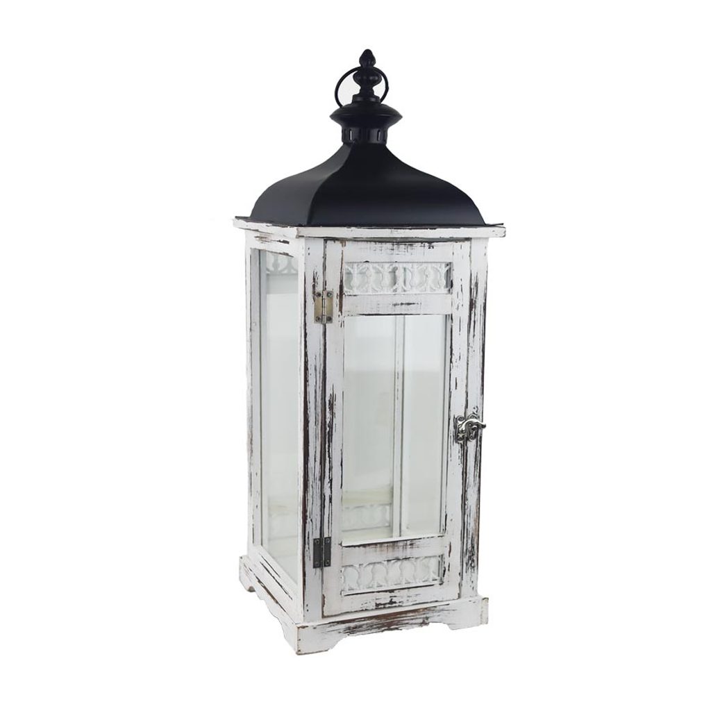 Dřevěná lucerna střední. Rozměry : 21 x 21 cm, výška 57,5 cm. Barva : kombinace bílá, šedá, černá. Materiál : dřevo, sklo, kov. Vneste do svého domova či zahrady kouzlo orientální stylu. Tato lucerna je vyrobena ze dřeva a skleněných panelů, horní část je z kovu. Lucerna má praktickou rukojeť, která vám usnadní její přenášení mezi domem a zahradou.