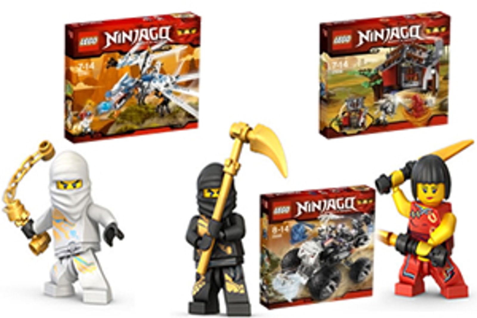 Postavy hry Ninjago - Sestra Ohně, Nindža Ohně, Nindža Blesku, Nindža Země, Nindža ledu a mistr Spinjitzu.