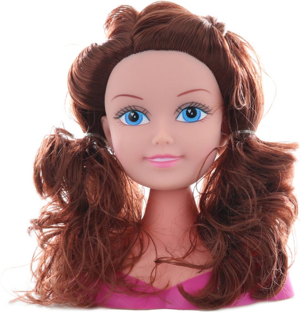 Česací hlava brunetka set s nůžkami a kadeřnickými doplňky plast