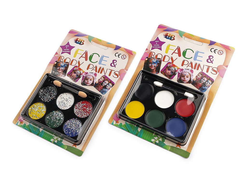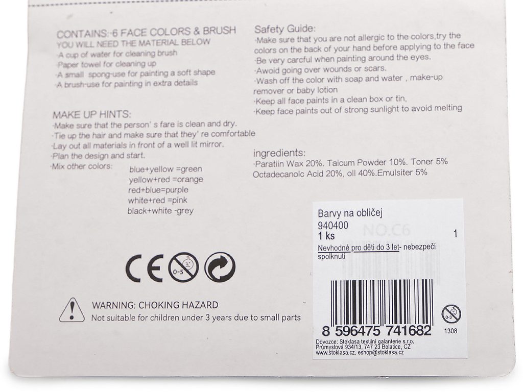 Barvy na obličej a tělo využijete na karnevaly, párty a různé oslavy. Snadno se nanášejí a jsou také lehce omyvatelné mýdlem a vodou nebo odličovacím mlékem. Nanášejte je na čistou a suchou pokožku. Dají se použít i jako běžné barvy pro malování na papír.Sada obsahuje 6 barev a oboustranný aplikátory na oční stíny.