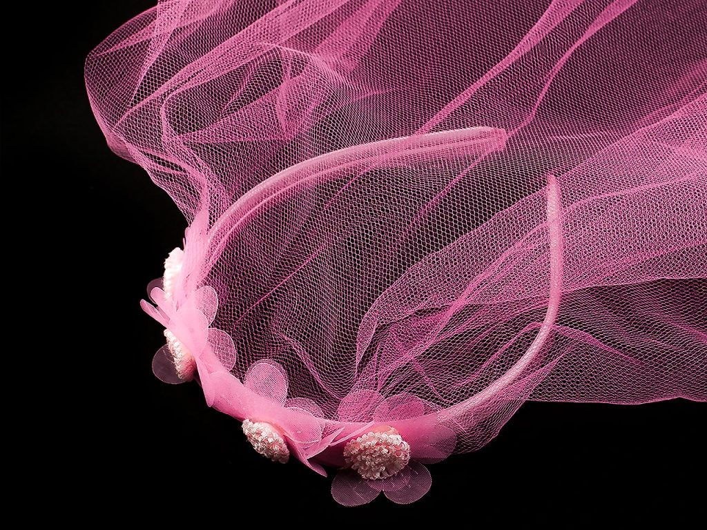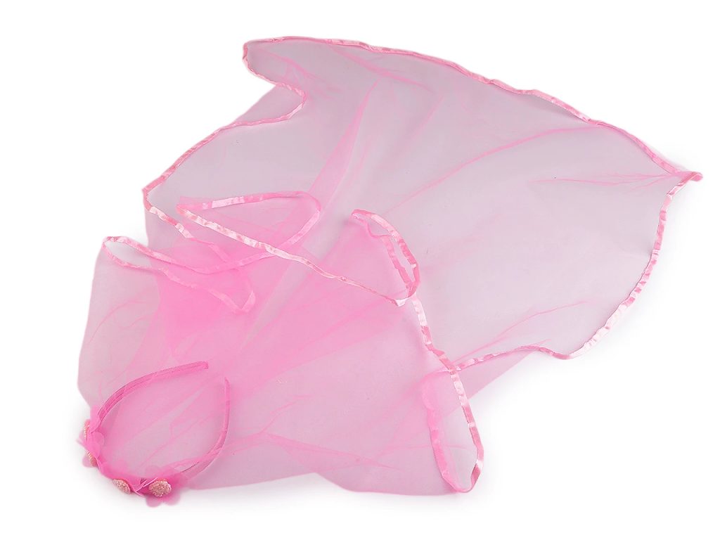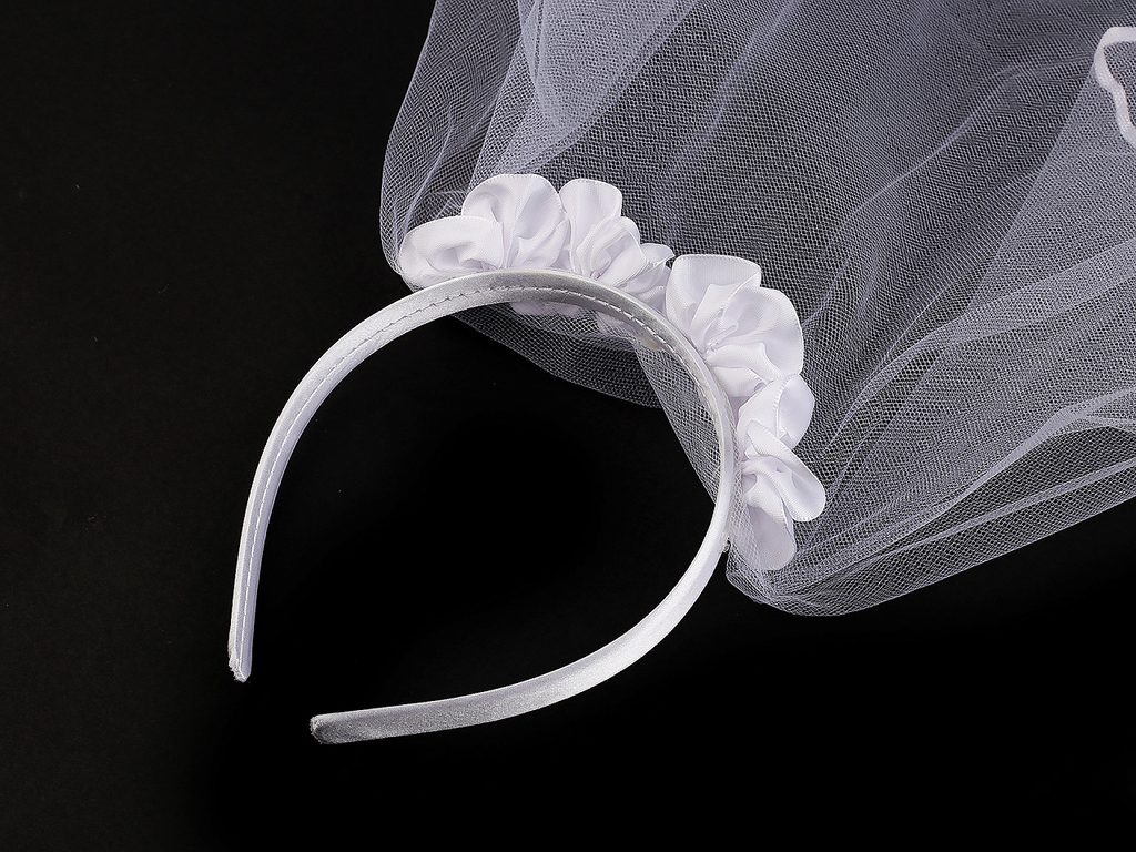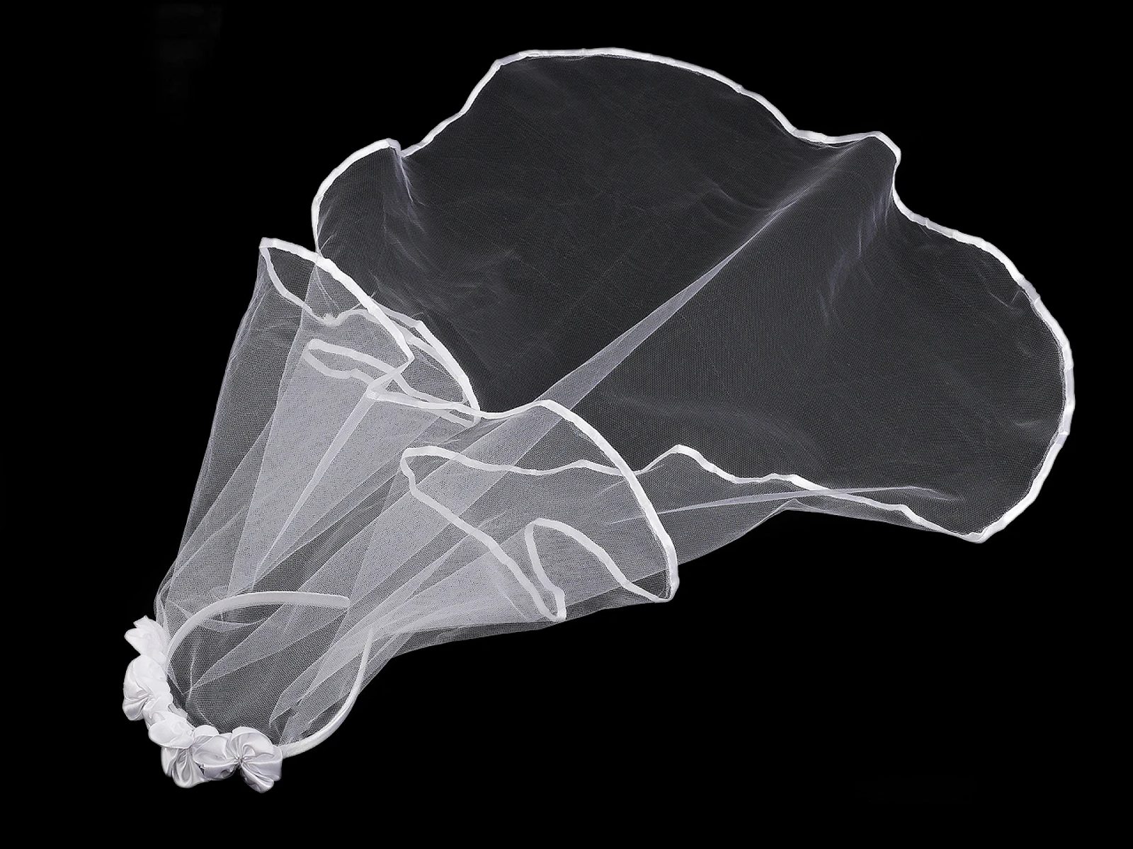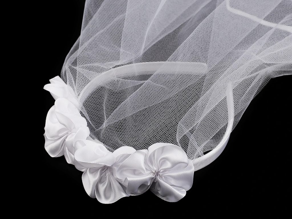 Okraj závoje je lemovaný saténovým proužkem.