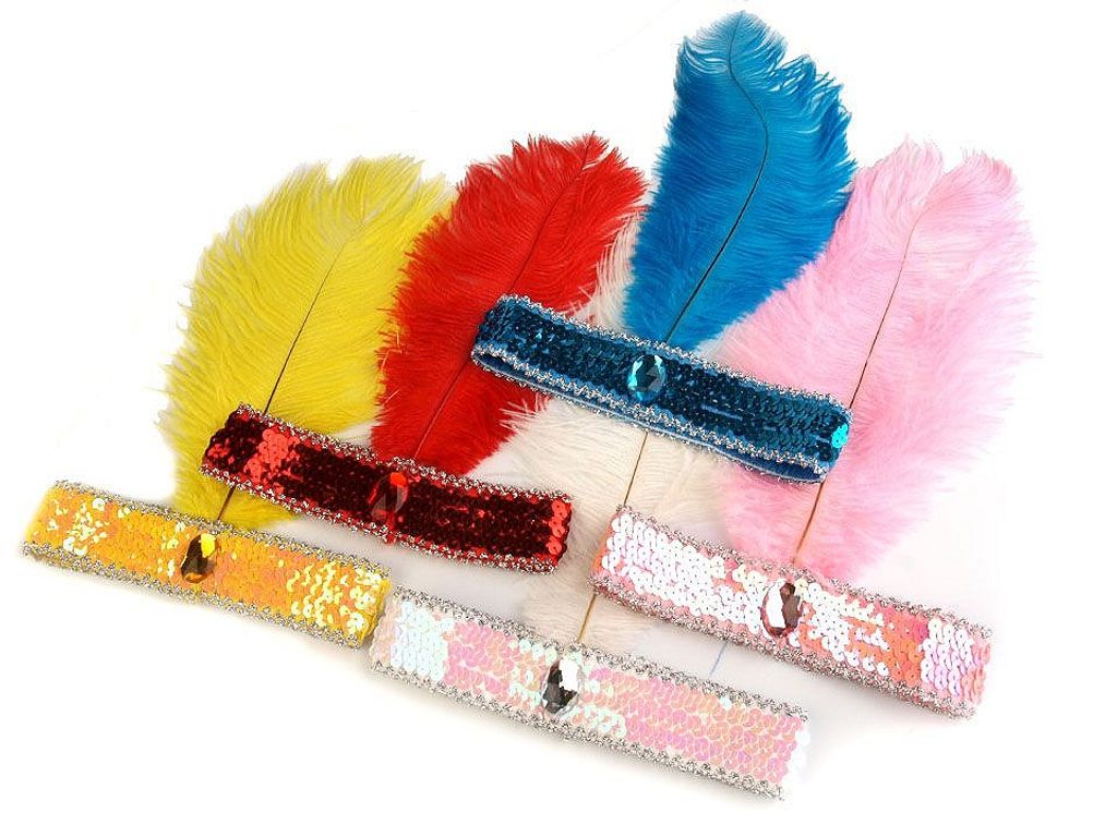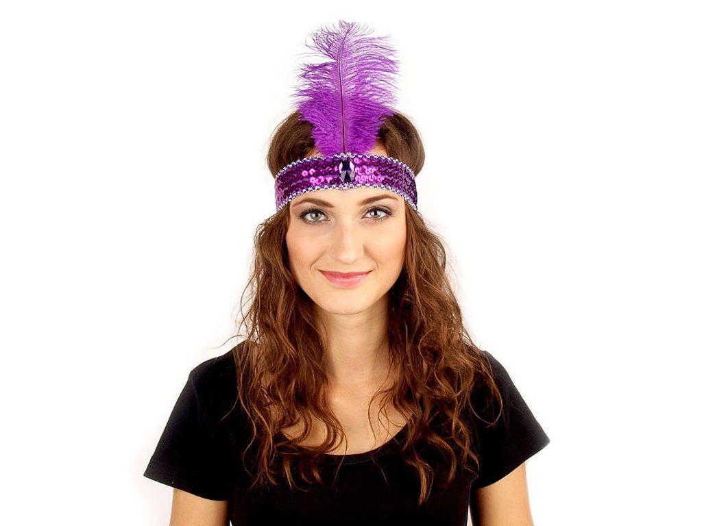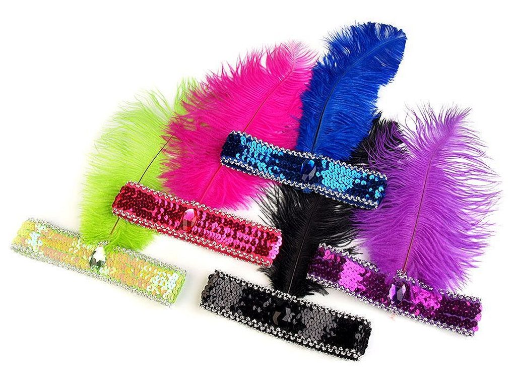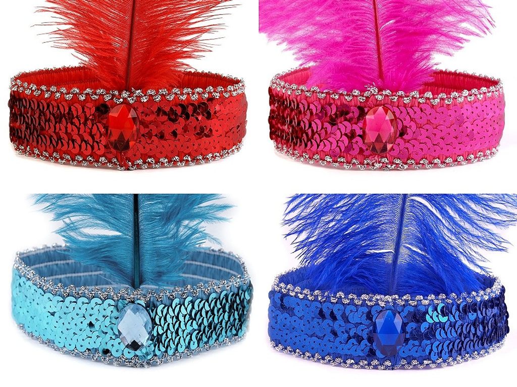 Karnevalová čelenka s peřím se skvěle hodí ke kostýmu z 30. let, kdy se tento doplněk hojně používal. Je elastická, přizpůsobí se každému. Díky flitrům se působivě leskne.- Šířka:: 4 cm