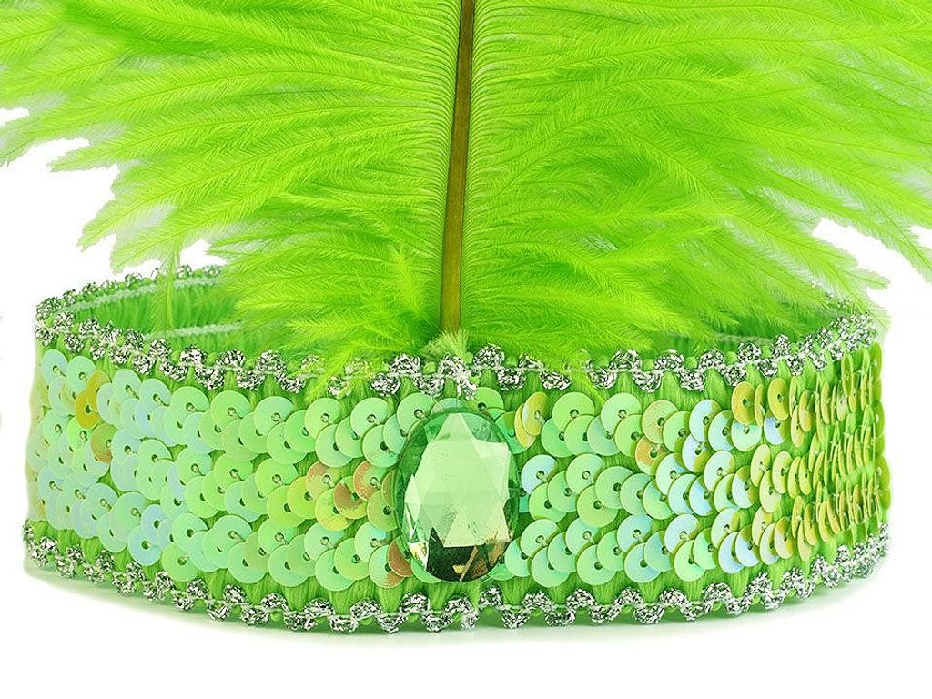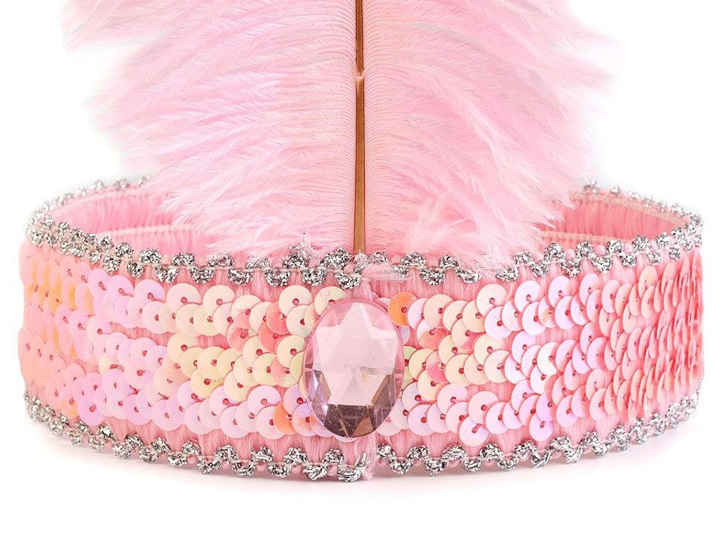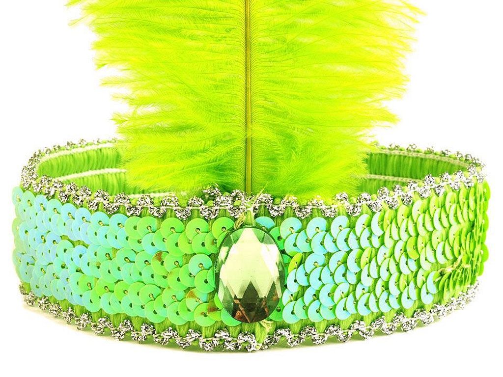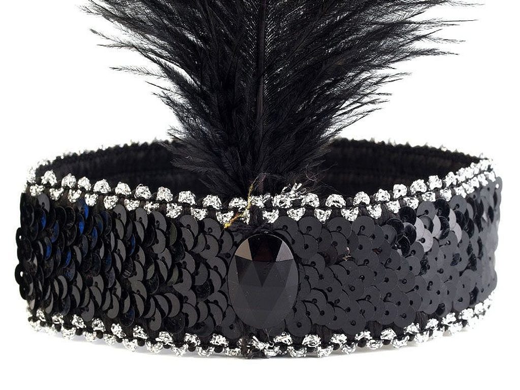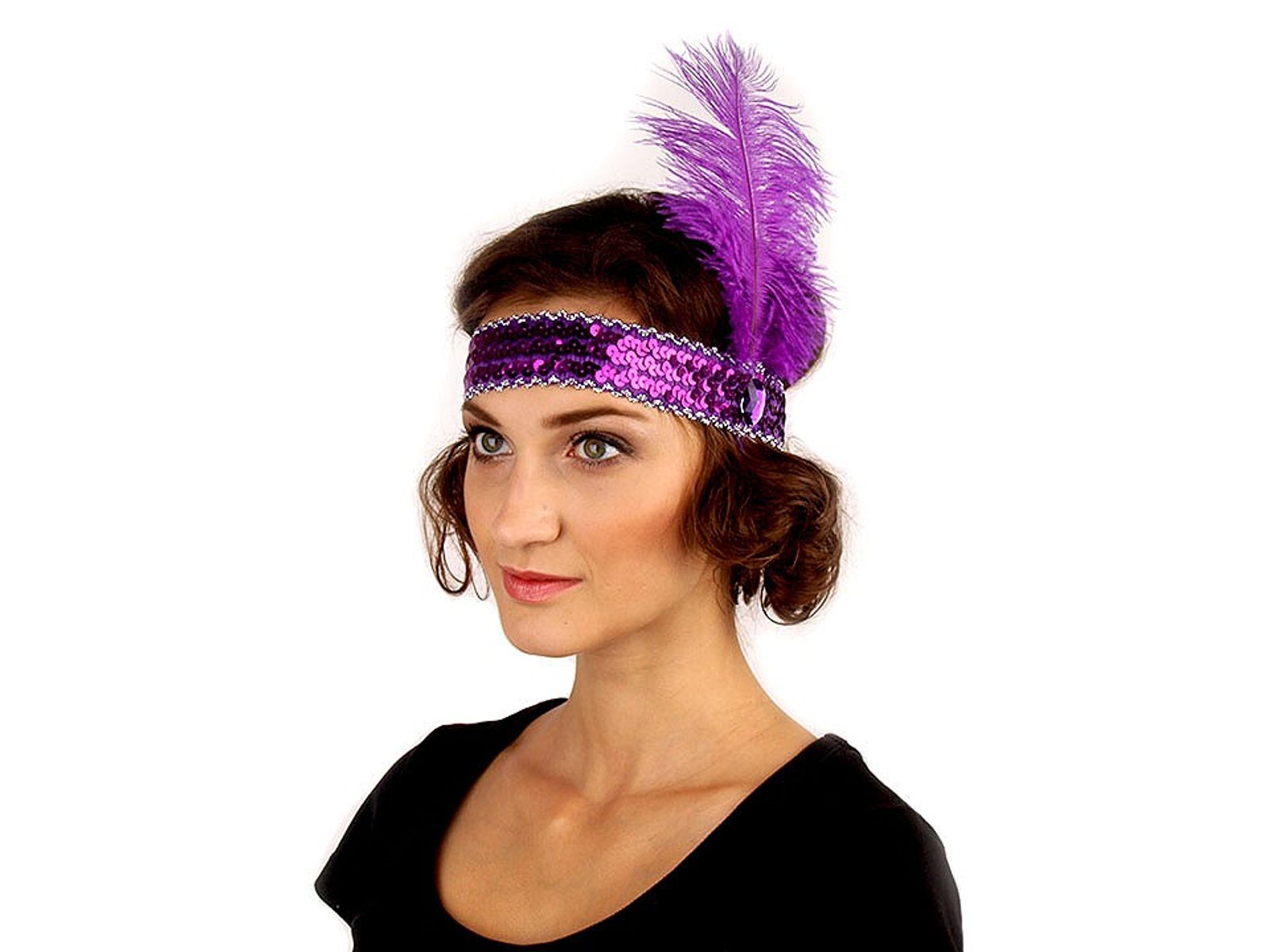 Karnevalová čelenka s peřím se skvěle hodí ke kostýmu z 30. let, kdy se tento doplněk hojně používal. Je elastická, přizpůsobí se každému. Díky flitrům se působivě leskne.- Šířka:: 4 cm