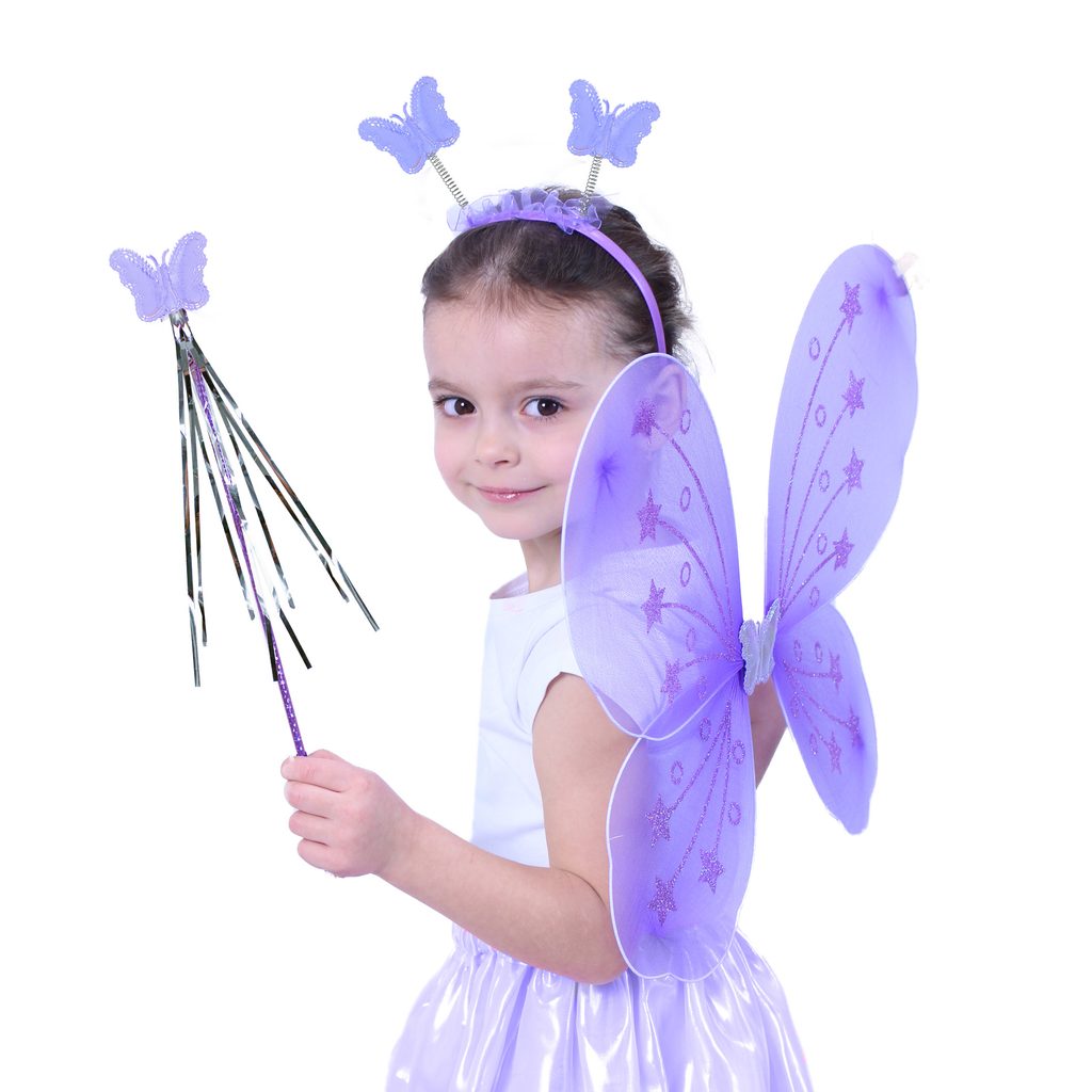 Roztomilá fialová motýlí křidélka na gumičku jsou určena pro holčičky ve věkovém rozmezí 3-10 let (104-150 cm). Součástí této karnevalové sady je také čelenka s motýlky na pružinkách a hůlka.
