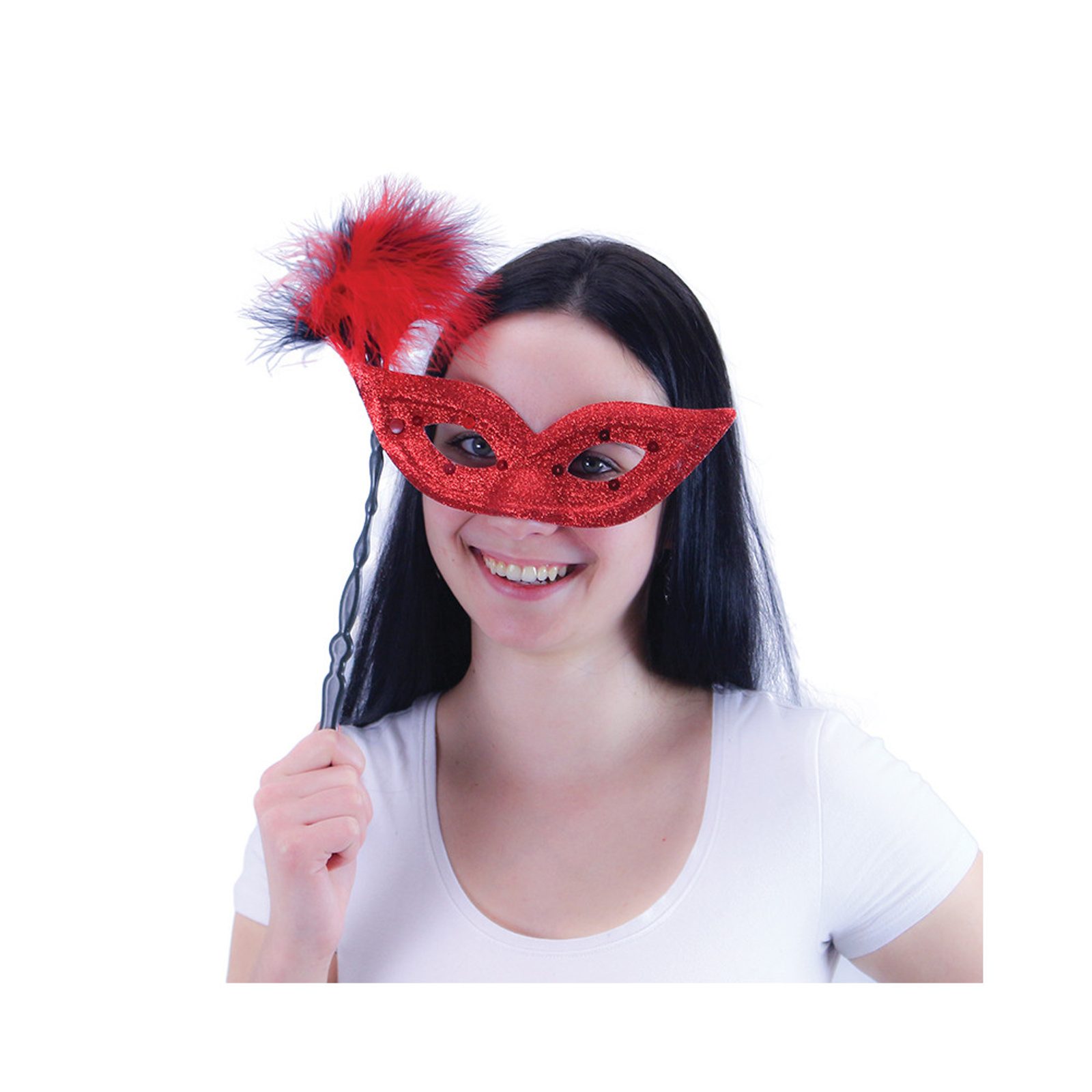 Elegantní škraboška se zlatým držátkem je zdobena hebkým peřím, oslnivými třpytkami a flitry. Staň se tajuplnou hvězdou karnevalového večírku díky této úchvatné škrabošce a ohrom tak všechny své přátele!
