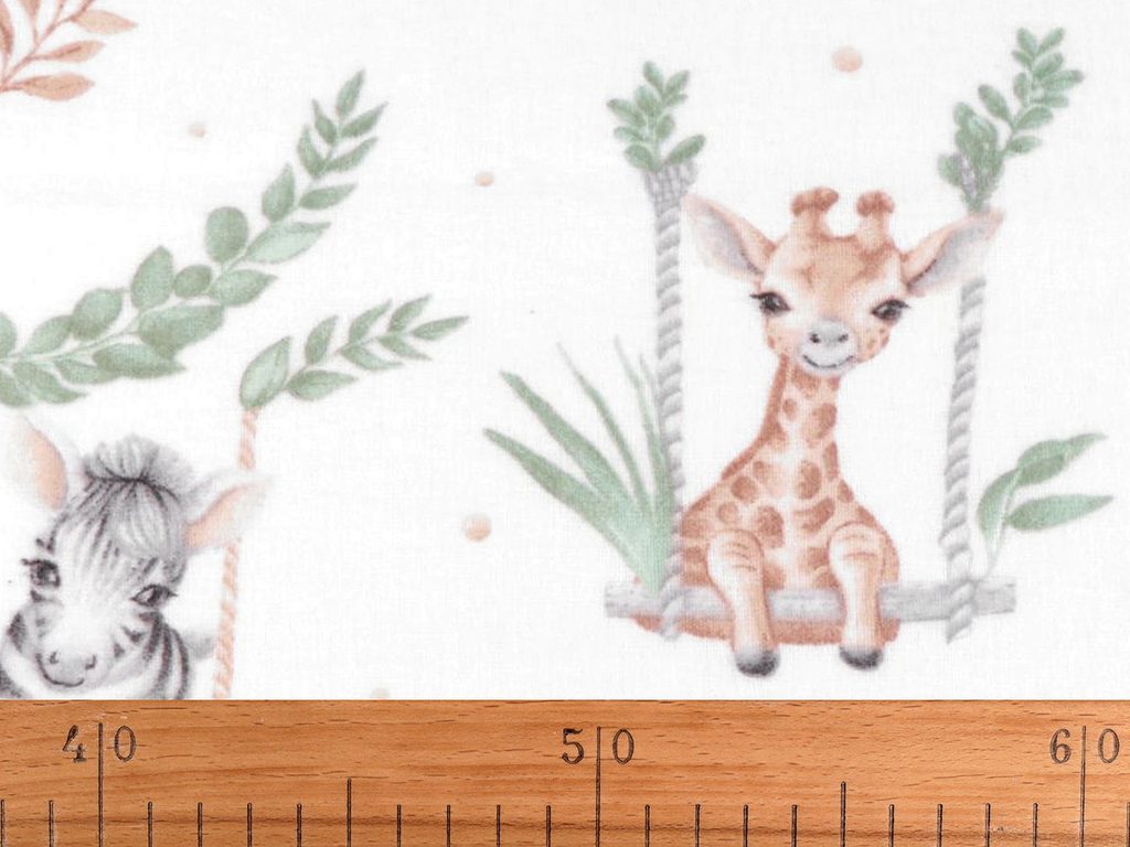 Bavlněný flanel je měkký, hřejivý a příjemný na dotek. Zdobí ho potisk roztomilých zvířátek ze safari.