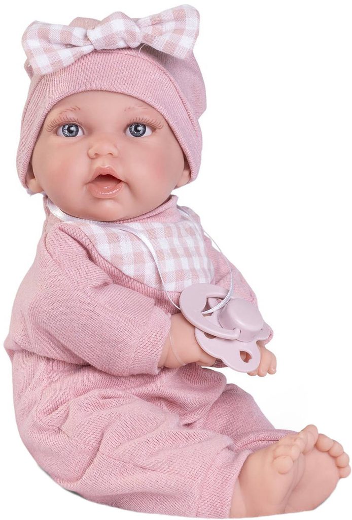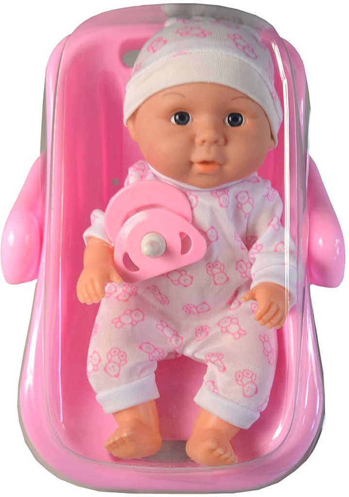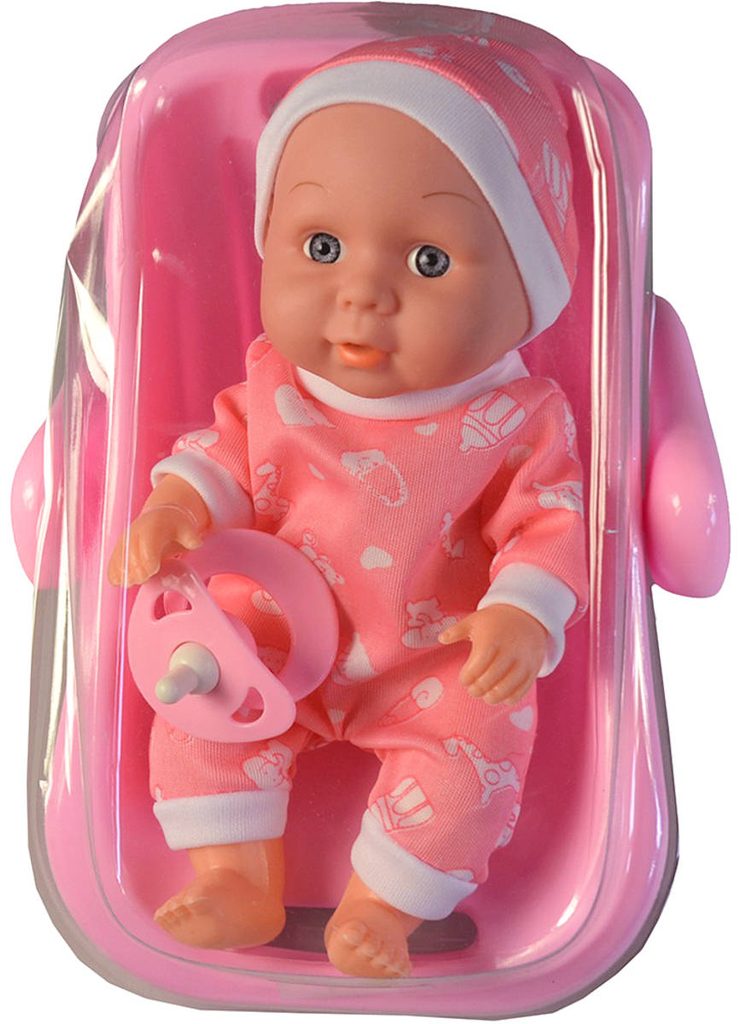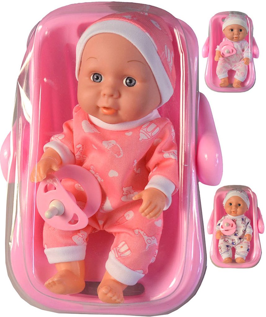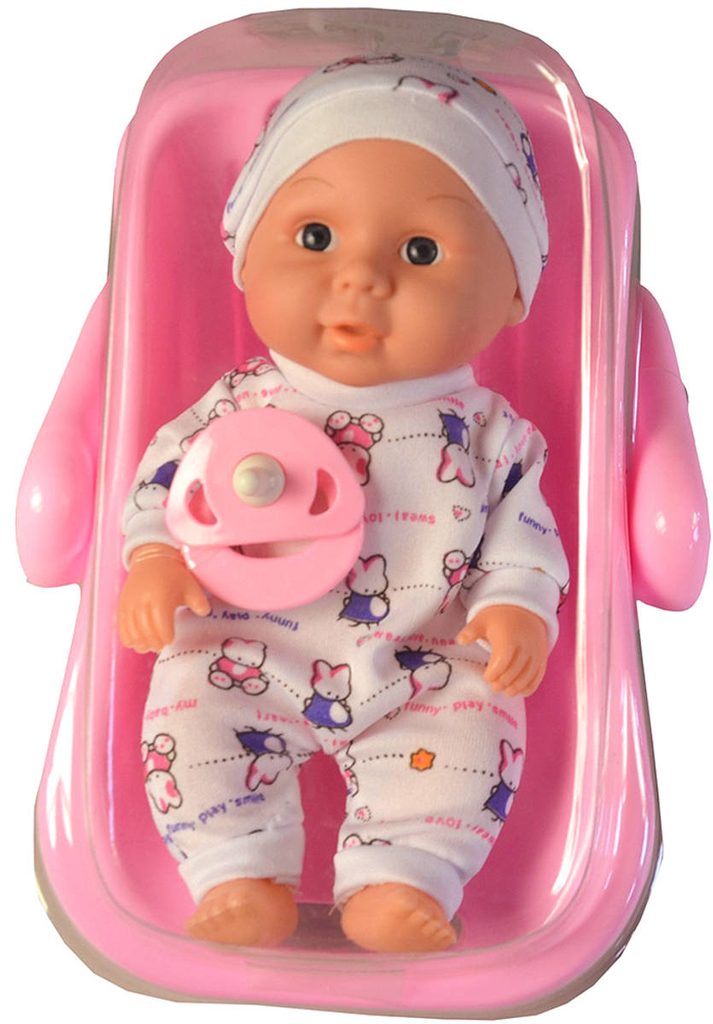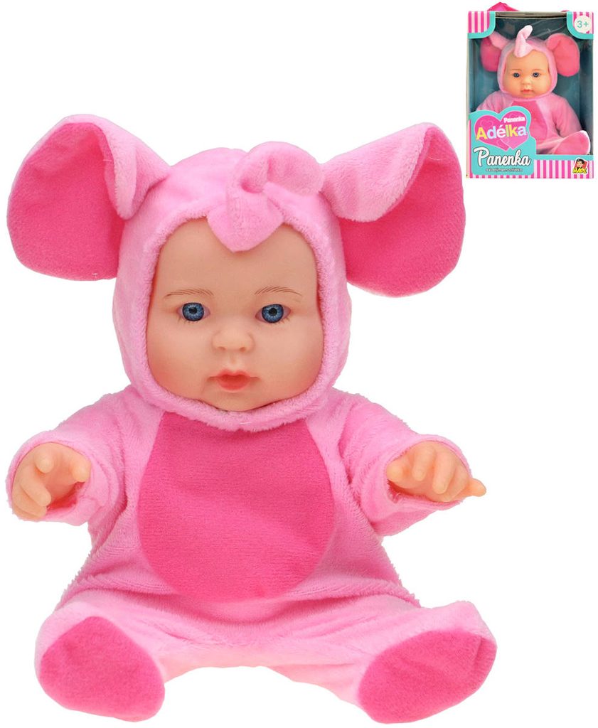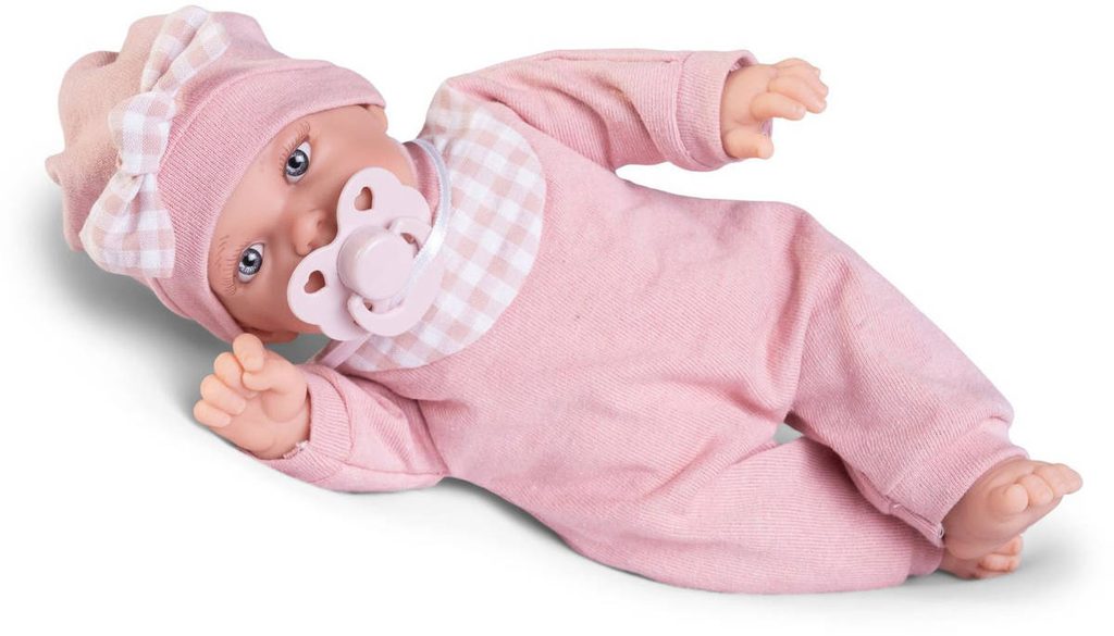 Roztomilé miminko s měkkým tělíčkem. Po stlačení tělíčka začne miminko vydávat zvuky (smích, pláč, mama, tata). Miminko je oblečeno do barevného pyžámka, které lze sundat (suchý zip). Baleno v plastovém